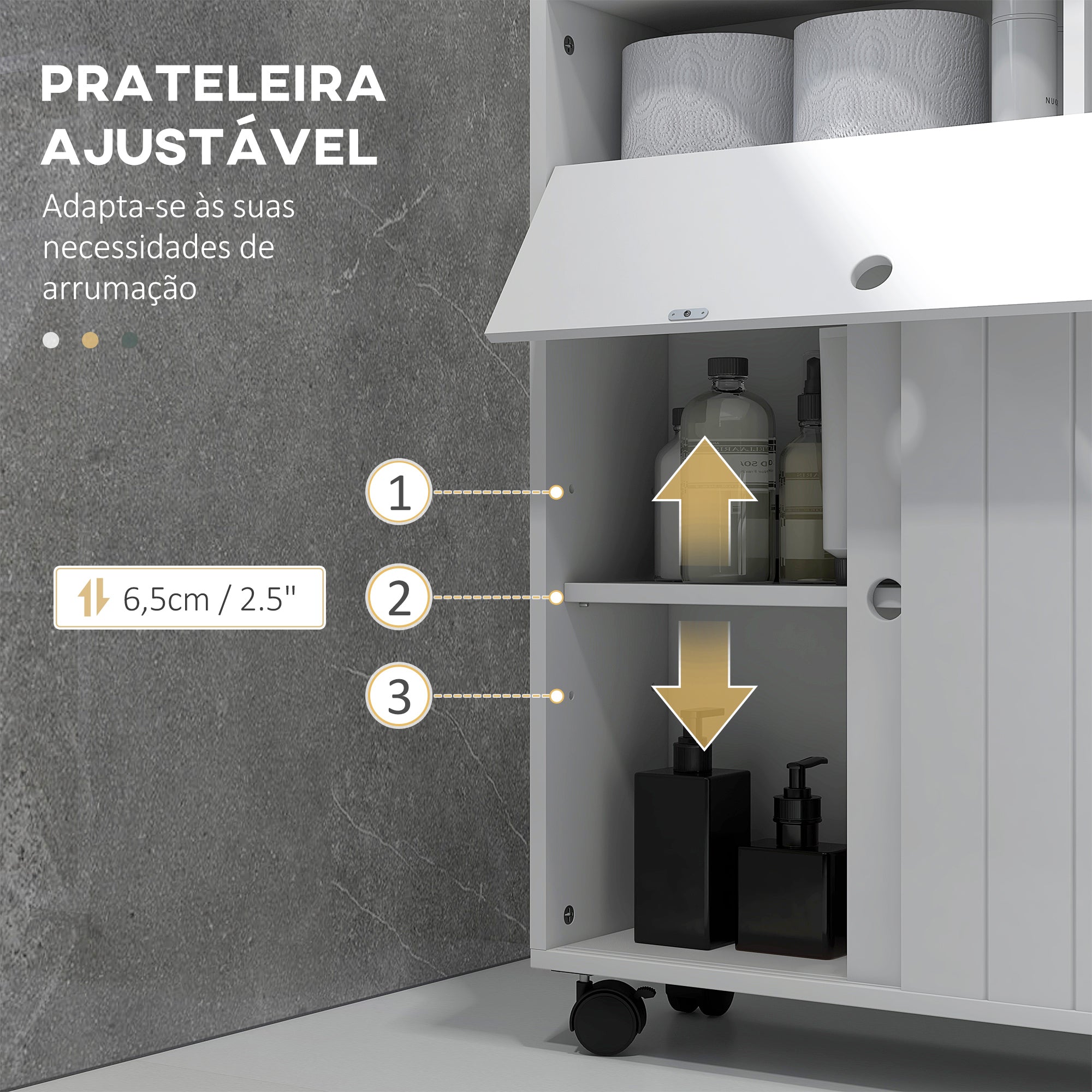 - Armário superior com porta articulada e dois compartimentos para armazenamento de papel higiénico Armário inferior com portas de correr e amplo espaço de arrumação no interior Quatro rodas giratórias para fácil movimentação e duas com travão Prateleira ajustável em 3 níveis para atender às suas diferentes necessidades Estilo moderno com cor branca, painéis ripados e puxadores recortados Estrutura em MDF resistente e fácil de limpar com um pano húmido O desenho compacto é ótimo para espaços limitados Requer montagem