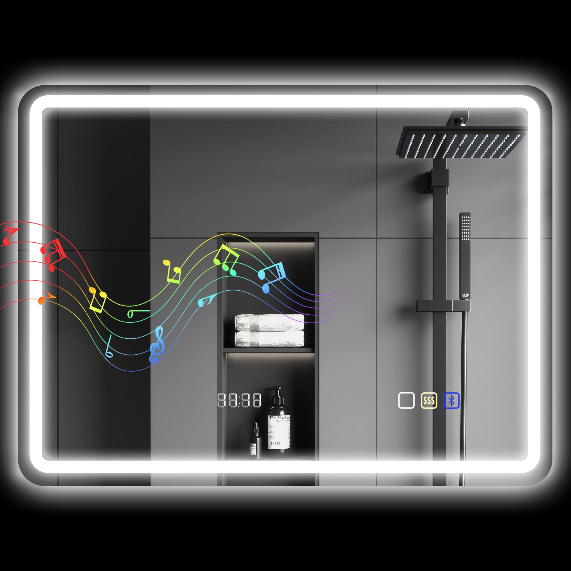 - COM BLUETOOTH E RELÓGIO: Torne as suas manhãs mais agradáveis com este espelho LED para casa de banho. Com Bluetooth integrado, pode ouvir as suas músicas favoritas enquanto se arruma. Além disso, o relógio integrado ajuda a manter o controlo do tempo