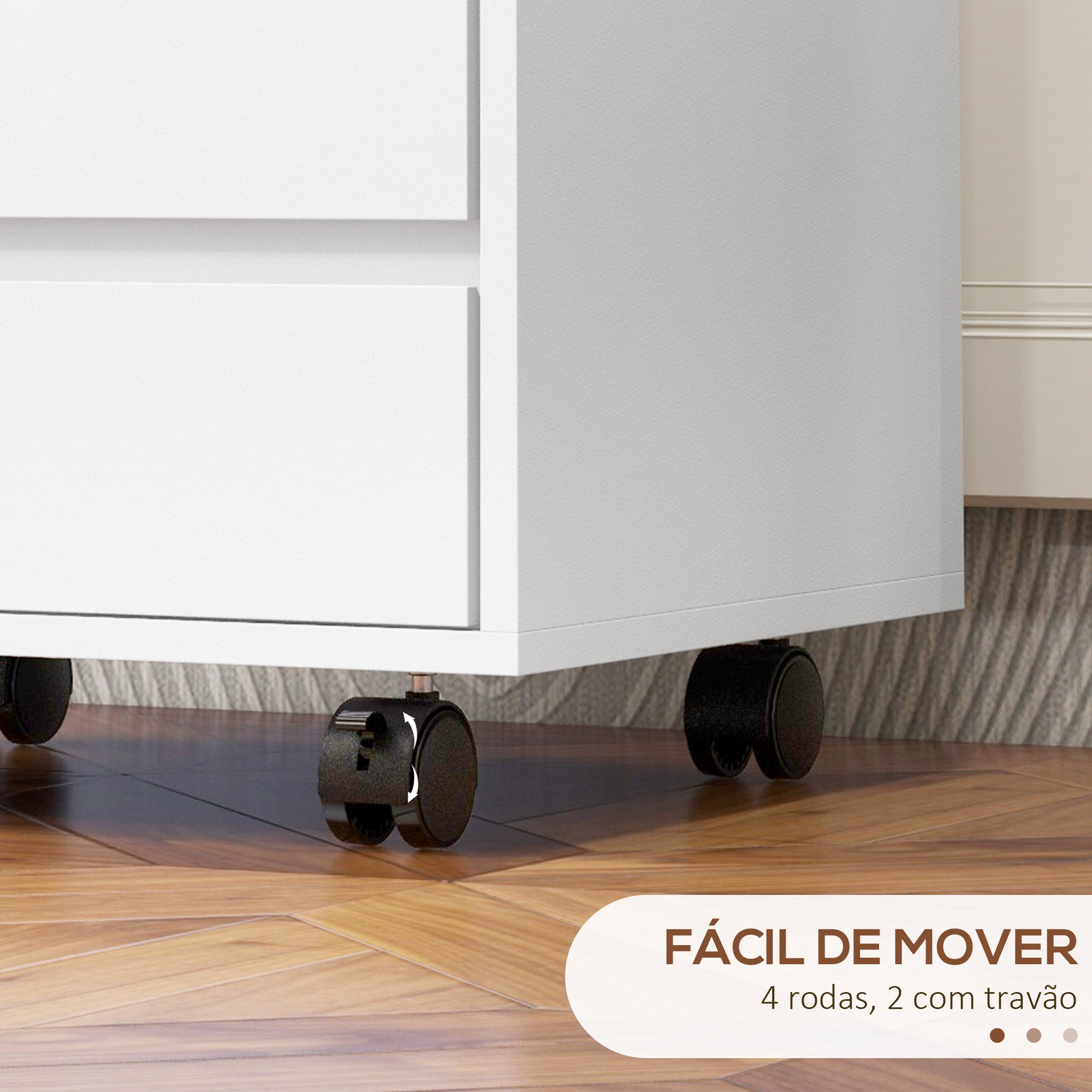 - O tamanho compacto adapta·se facilmente à maioria dos escritórios e salas de estudo As quatro gavetas espaçosas permitem organizar documentos e materiais de forma prática As rodas facilitam a movimentação, sendo duas com travão para maior estabilidade A estrutura em MDF E1 com proteção anti·tombo garante resistência e segurança O acabamento em branco combina facilmente com qualquer estilo de decoração A capacidade máxima de carga é de 20 kg Requer montagem