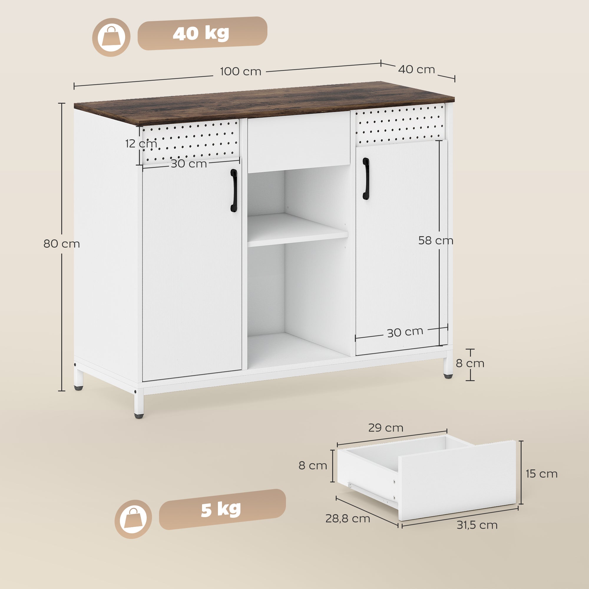 • Cor: Branco e castanho rústico Material: Melamina de madeira e metal Medidas totais: 100x40x80 cm (CxLxA) Medidas do compartimento aberto: 32x33x18,5 cm (CxLxA) (superior), 32x33x34 cm (CxLxA) (inferior) Medidas internas da gaveta: 29x28,8x8 cm (CxLxA) Medidas internas do armário: 30x35x68,5 cm (CxLxA) Altura dos pés: 8 cm Capacidade máxima: 40 kg (total), 20 kg (bancada), 5 kg (prateleira) Referência: 838·577V00WT O pacote inclui: ? 1 x Aparador; ? 1 x Manual de instruções