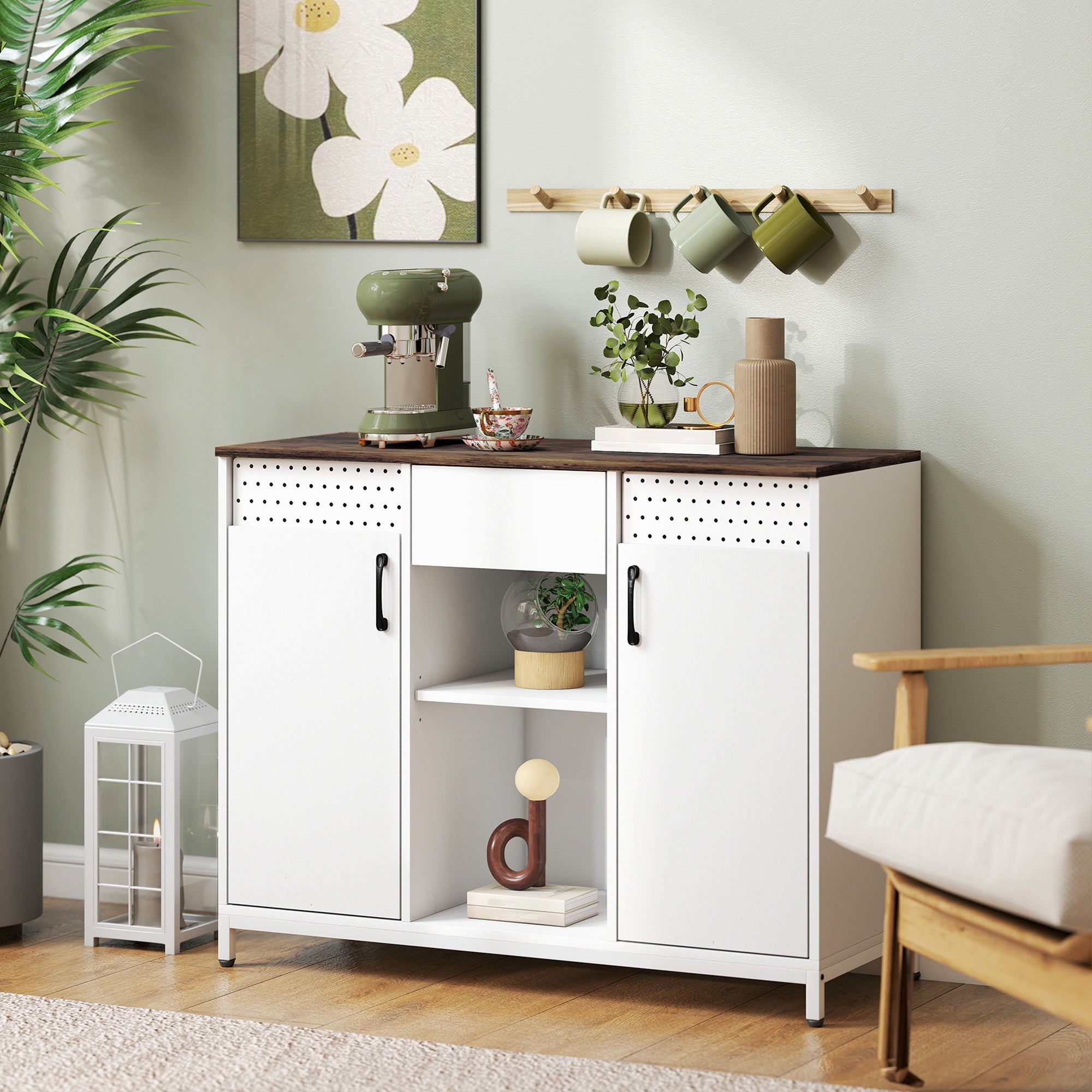 Aparador de 2 Portas com Orifícios Aparador de Sala com 2 Compartimentos e Gaveta Prateleiras Ajustáveis para Cozinha Entrada Dormitório 100x40x80 cm Branco e Castanho Rústico