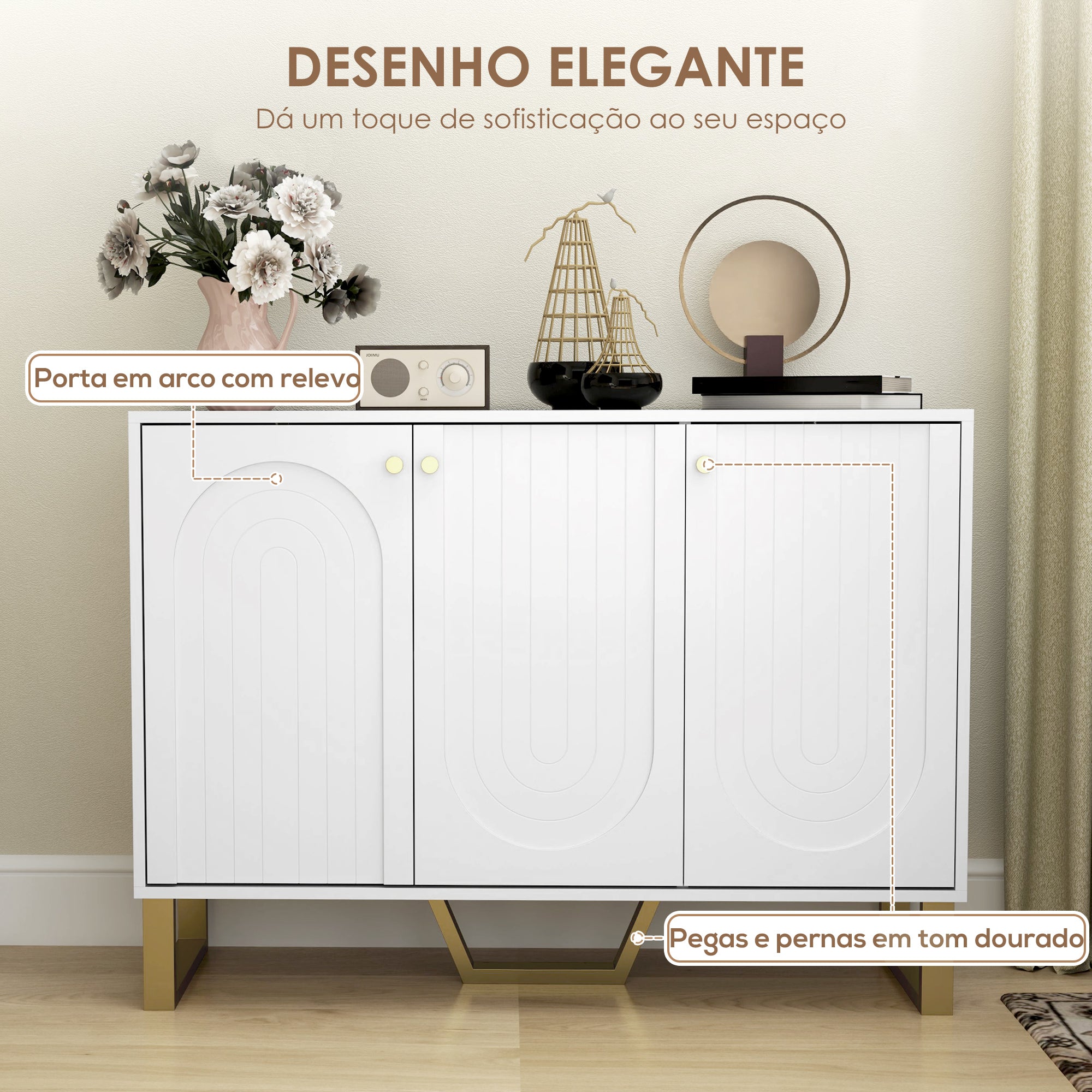 - TOQUE ELEGANTE NO DESENHO: Este aparador destaca·se pelas portas com desenho arqueado em relevo, dispostas de forma assimétrica para um efeito visual atrativo. Os puxadores e pés dourados acrescentam um toque elegante que valoriza qualquer espaço