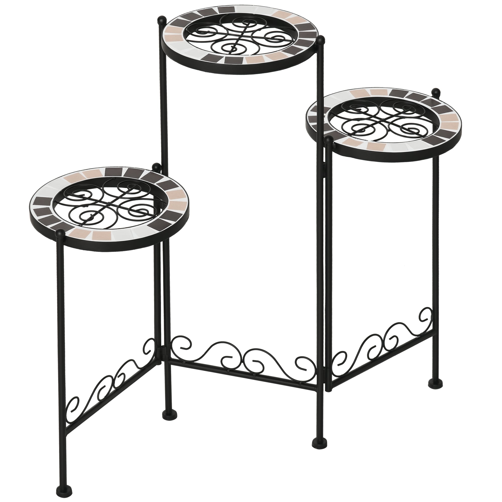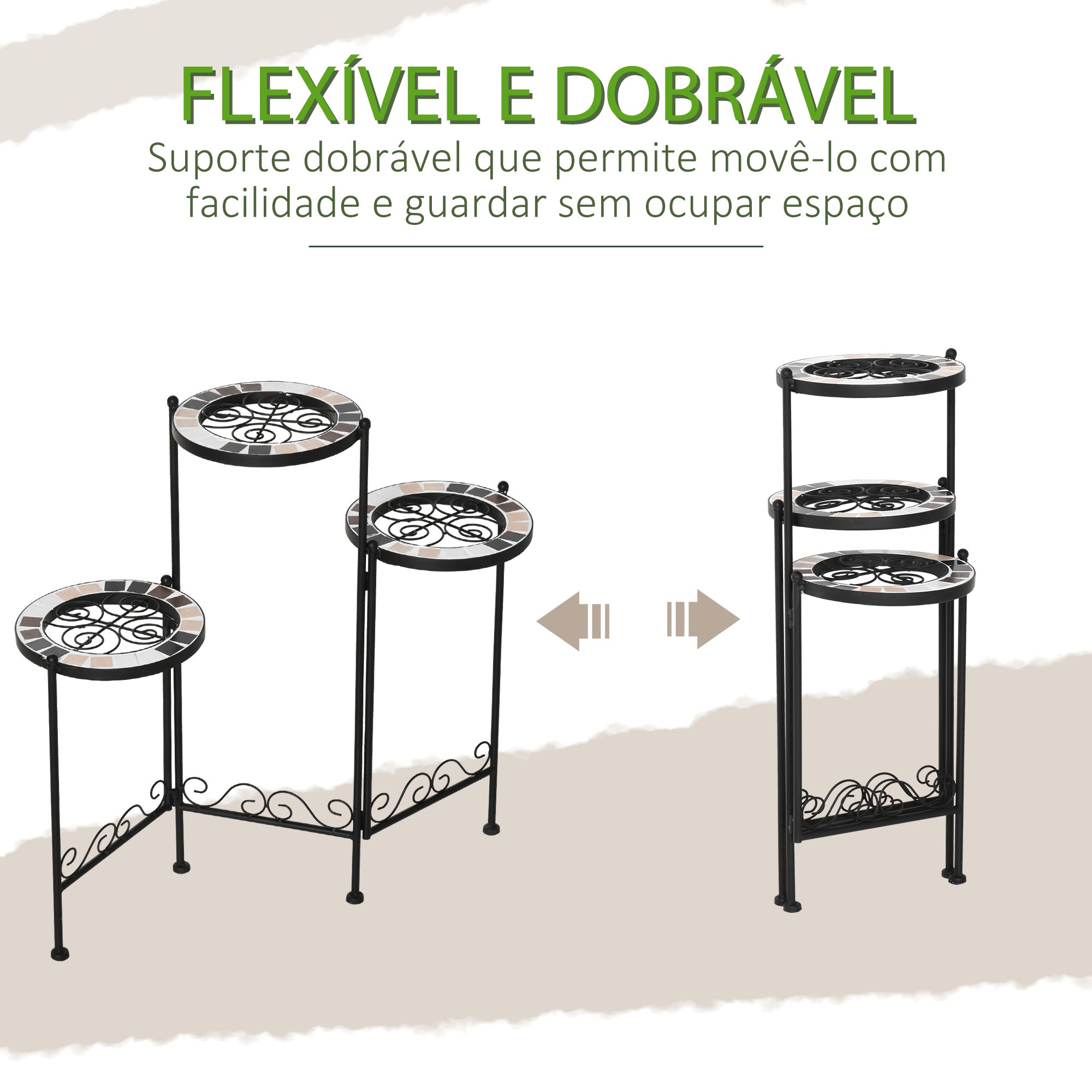 - MEDIDAS TOTAIS: 60x22x65cm (CxLxA). Capacidade de peso: 10kg (cada prateleira) Este suporte para vasos de plantas Outsunny com 3 níveis é a escolha perfeita para decorar seu jardim e sua casa. Fabricado de metal, é resistente e ideal para um uso prolongado. Possui lindas gravuras e um mosaico e azulejo que dará um toque de elegância a onde o coloque. Ideal para colocar seus vasos de plantas ou outros itens que deseja expor. E o melhor, quando não estiver em uso pode ser dobrado, economizando assim espaço. Não perca essa oportunidade e deixe o seu jardim ainda mais bonito!