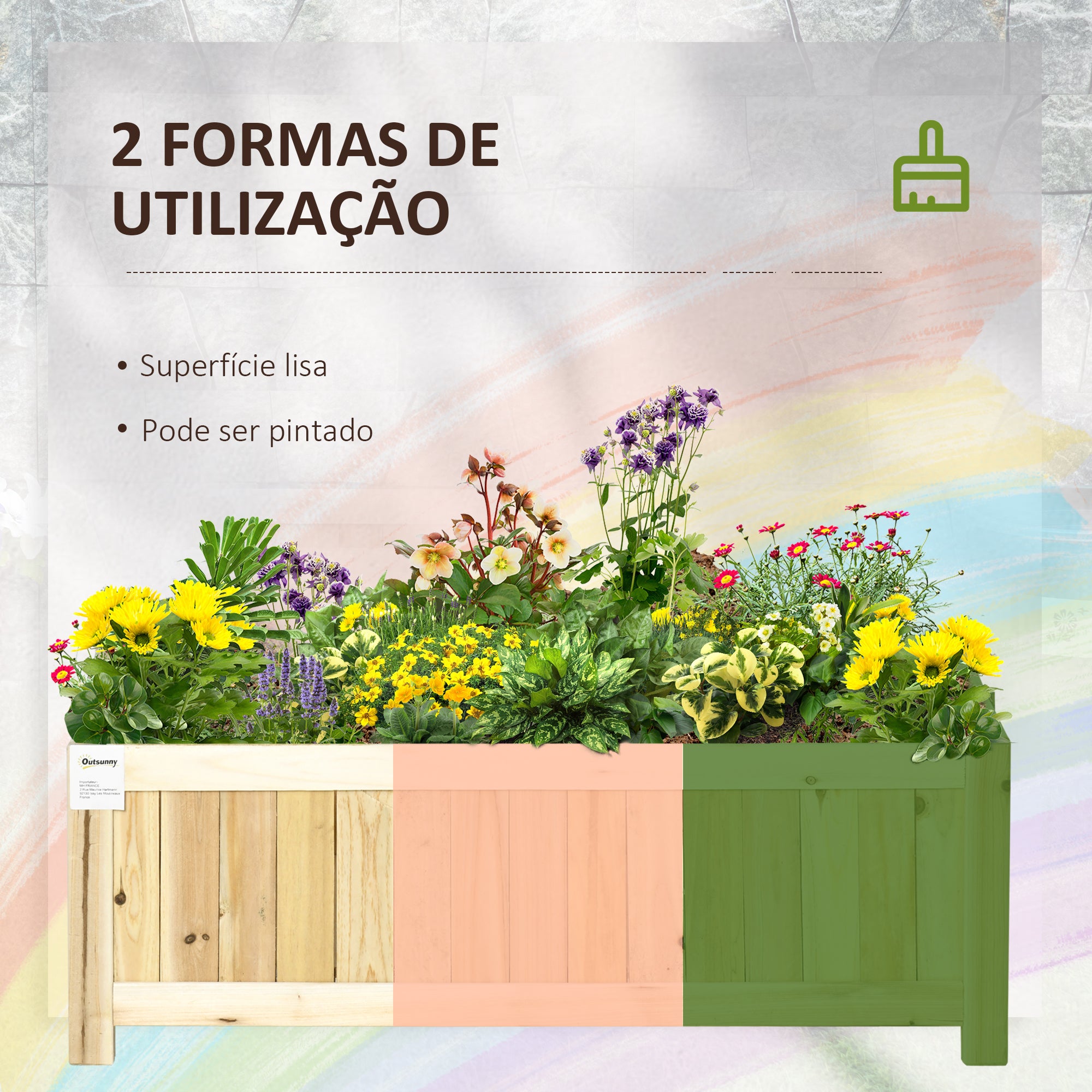 - RESISTENTE: A robustez e durabilidade são essenciais numa boa floreira, e este modelo não é exceção. Fabricado com madeira de abeto, reconhecida pela sua resistência e durabilidade. Este material garante não apenas a resistência da floreira às condições climáticas, mas também permite personalizá·la ao gosto. Pode ser pintada na cor desejada para harmonizar com o resto do jardim