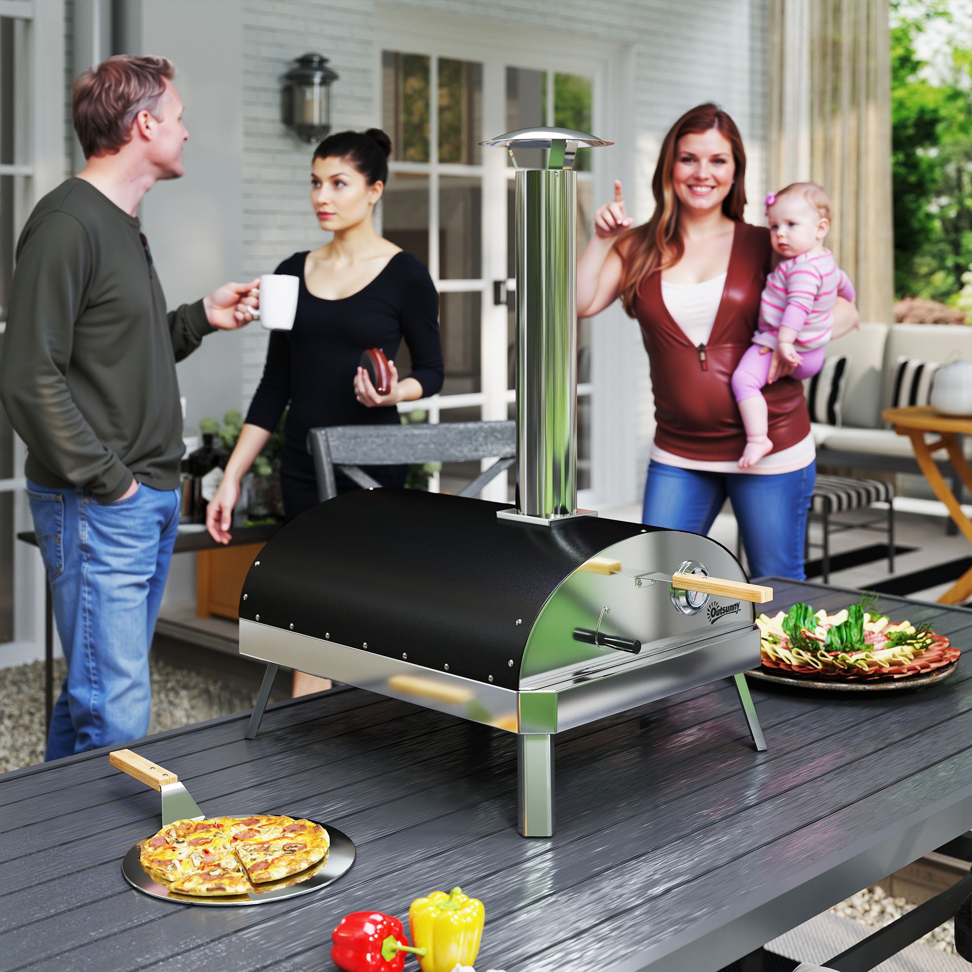 Mini Forno de Pizza Exterior Portátil Forno a Lenha com Pedra Refratária Ø33 cm Pá Pegas de Madeira Termómetro e Bandeja Giratória para Jardim Varanda Campismo Pátio 84x47x82 cm Prata