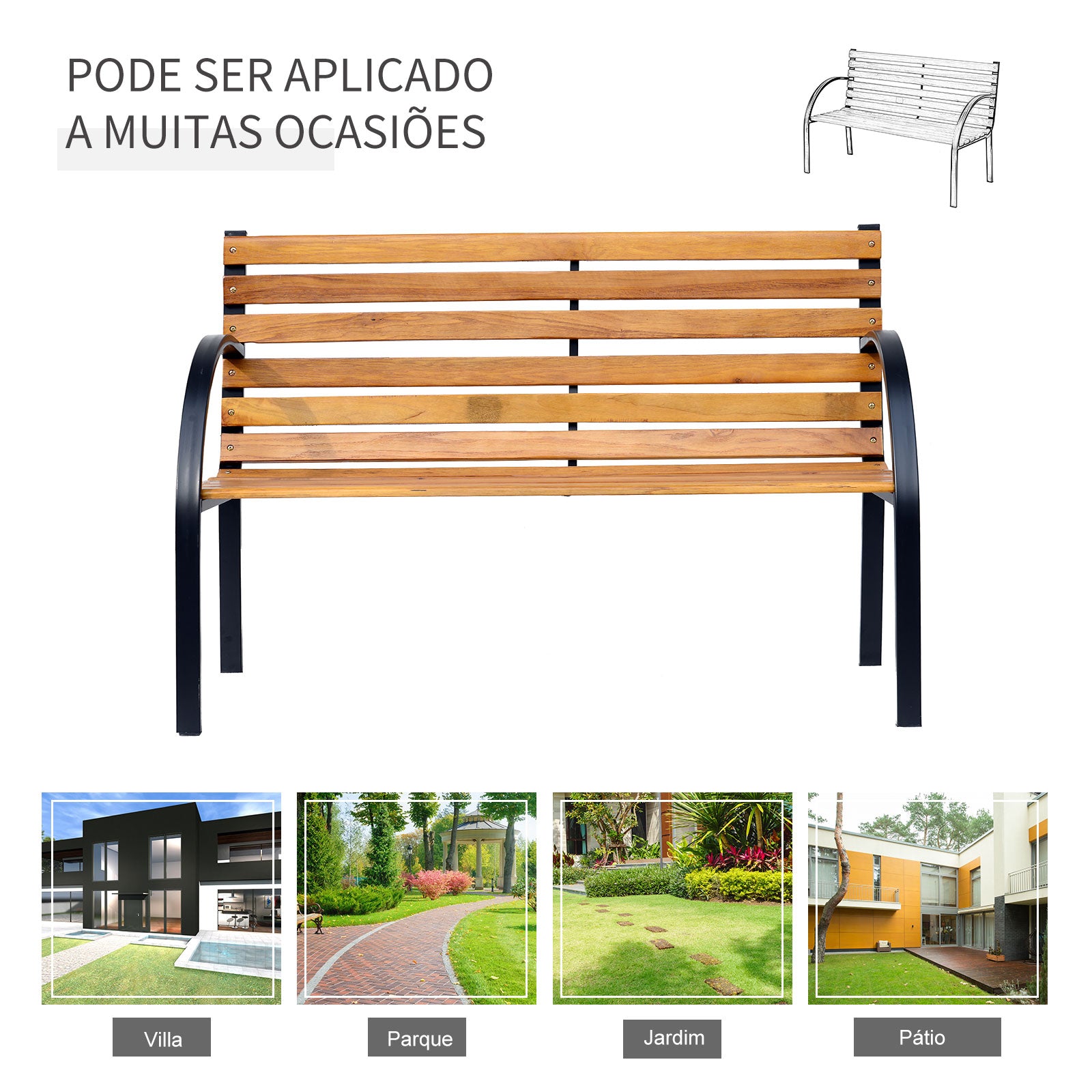 - MEDIDAS TOTAIS: 122x60x80 cm (CxLxA); Medidas do assento: 122x41x39 cm (CxLxA); Carga máxima: 230 kg Você já viu esse banco Outsunny? Fabricado em aço galvanizado e madeira maciça, possui uma estrutura robusta capaz de suportar até 230 kg e oferece um assento espaçoso para 2 pessoas sentadas juntas. Seu encosto ergonômico e os dois apoios de braços laterais oferecem grande conforto e adaptabilidade ao corpo. Ideal para ter no seu jardim, terraço ou qualquer ambiente urbano ao ar livre como caminhos, parques, etc.