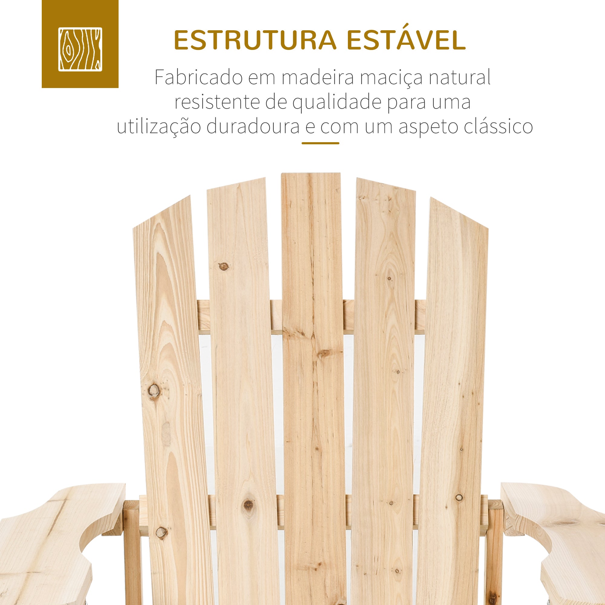 - MEDIDAS TOTAIS: 78x89x88 cm (CxLxA). Capacidade máxima de peso: 150 kg. Requer montagem Gostaria de relaxar no seu jardim com um assento confortável? Esta cadeira adirondack da Outsunny é ideal! Fabricada em madeira de abeto resistente, esta cadeira é ideal para uma utilização prolongada. Graças ao assento levemente curvado, encosto alto e apoio para os braços, esta cadeira adirondack de jardim oferece um conforto excelente. Graças ao seu estilo rústico, esta cadeira é ideal para adicionar um toque de elegância ao seu espaço exterior. Sente·se relaxe e desfrute de um bom momento ao ar livre!