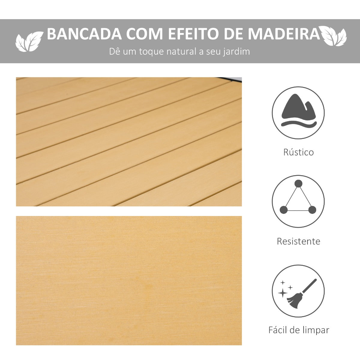 - BANCA COM IMITAÇÃO DE MADEIRA: As ripas plásticas da bancada desta mesa de jardim têm uma textura que reproduz a da madeira. Duráveis, fáceis de limpar e de secagem rápida, são duráveis e adequados para uso externo