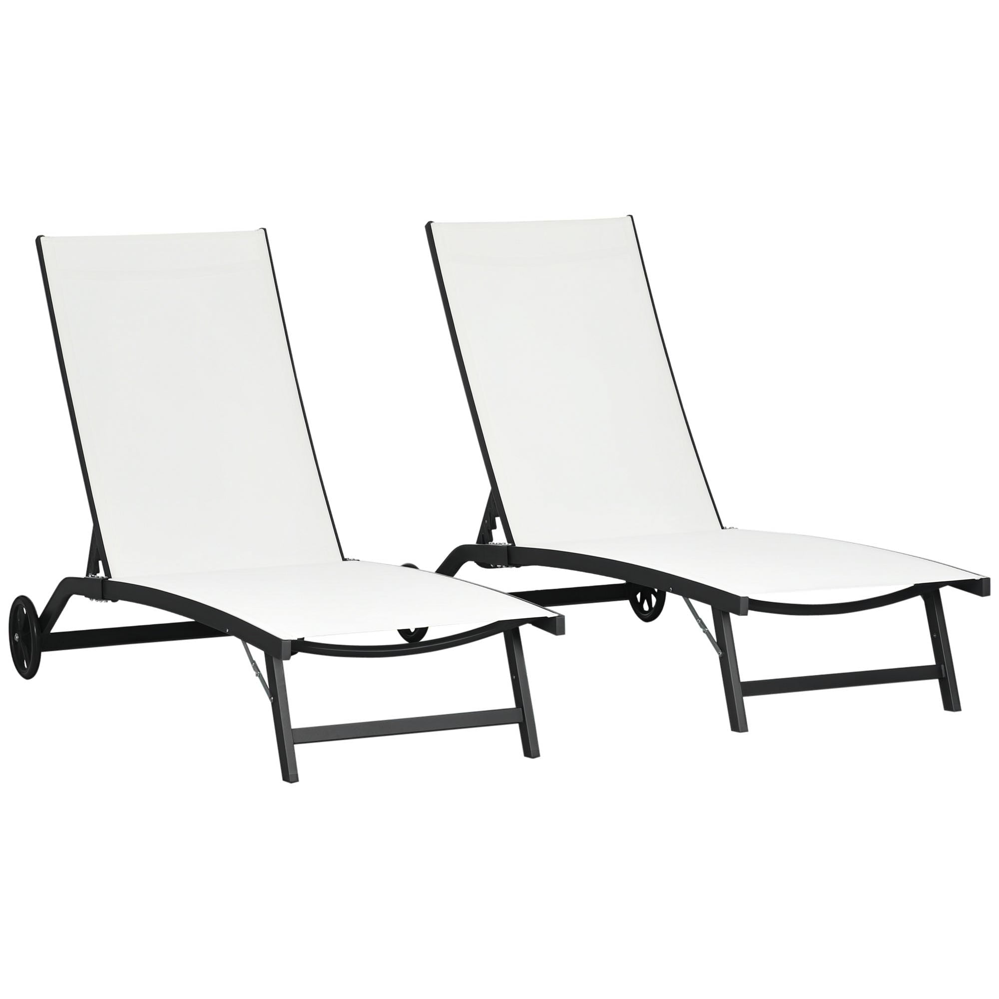 - MEDIDAS TOTAIS: 66x165x102 cm (CxLxA). Medidas planas: 195x66x34 cm. Peso máximo suportado: 150 kg (cada). Requer montagem Este conjunto de espreguiçadeiras de exterior da Outsunny tem uma estrutura metálica muito resistente e um corpo em tecido de malha respirável, com grande resistência às intempéries e aos raios UV. Os encostos têm 5 posições ajustáveis para lhe proporcionar um melhor relaxamento. Além disso, cada espreguiçadeira tem 2 rodas nas costas para se deslocar facilmente de um lugar para outro em busca da sombra do seu jardim, mais perto da piscina, etc.