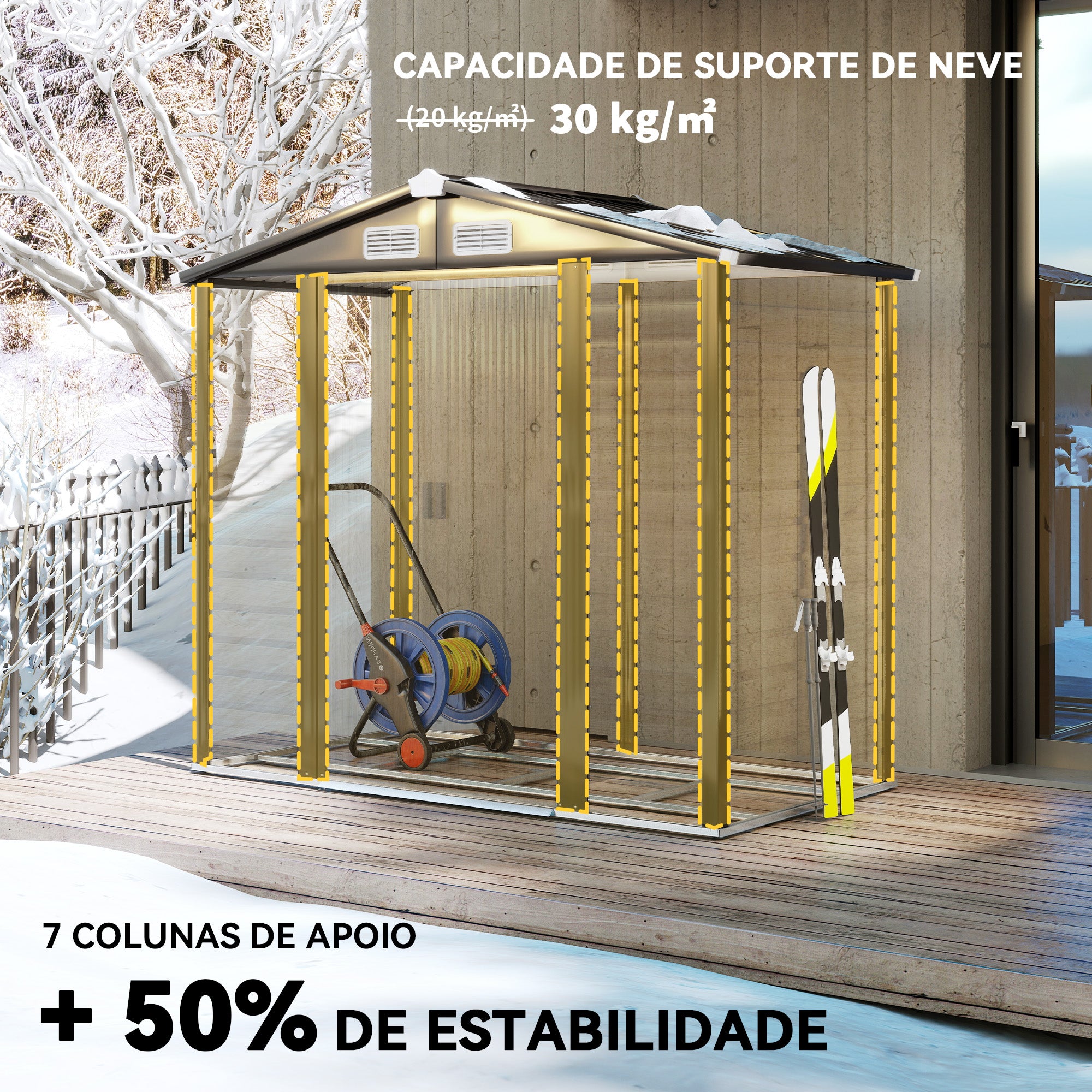 • Cor: Madeira e marrom Material: Aço galvanizado Medidas totais: 213x120x166/194 cm (CxLxA) Medidas da base: 207x114 cm (CxL), 2,36 m² Medidas interiores: 197x97 cm (CxL) Medidas da porta individual: 93x158 cm (CxA) Medidas das ventilações: 22,5x9,5 cm (CxA) Carga máxima de neve: 30 kg/m² Referência: 84H·225V00AK O pacote inclui: