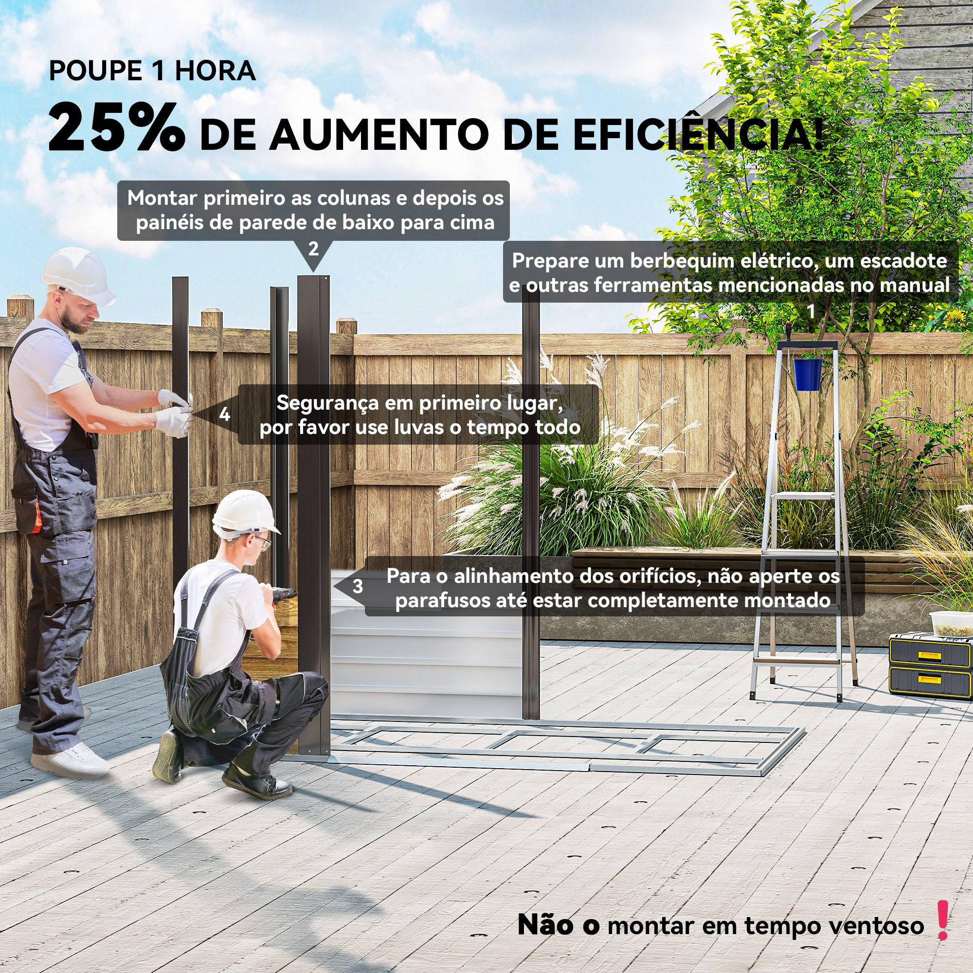 • MONTAGEM SIMPLIFICADA: Graças ao seu desenho com ripas horizontais, a montagem é mais simples. Recomenda·se realizar a instalação entre 2·3 pessoas, com um tempo estimado de 3 horas. Inclui luvas de proteção para uma montagem segura