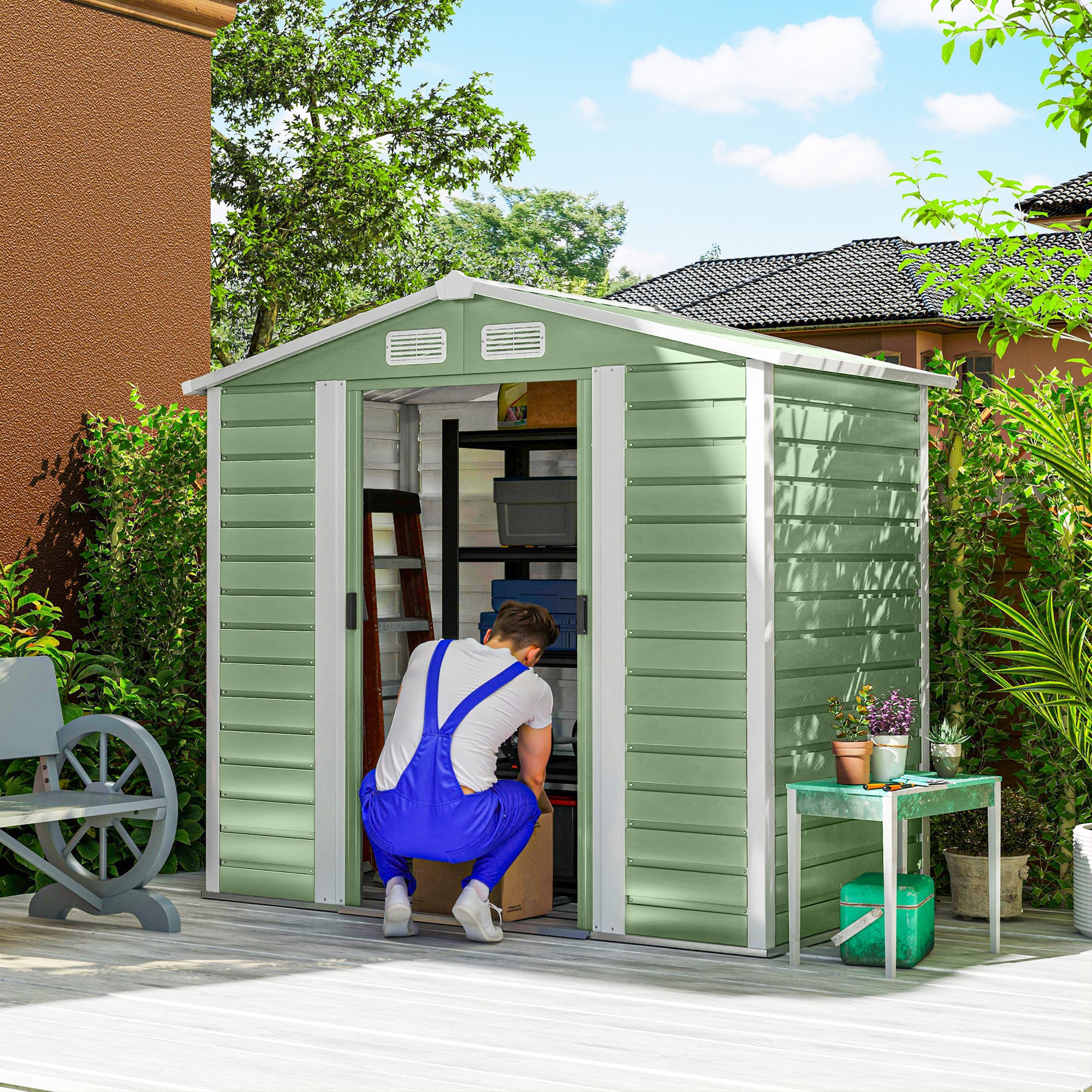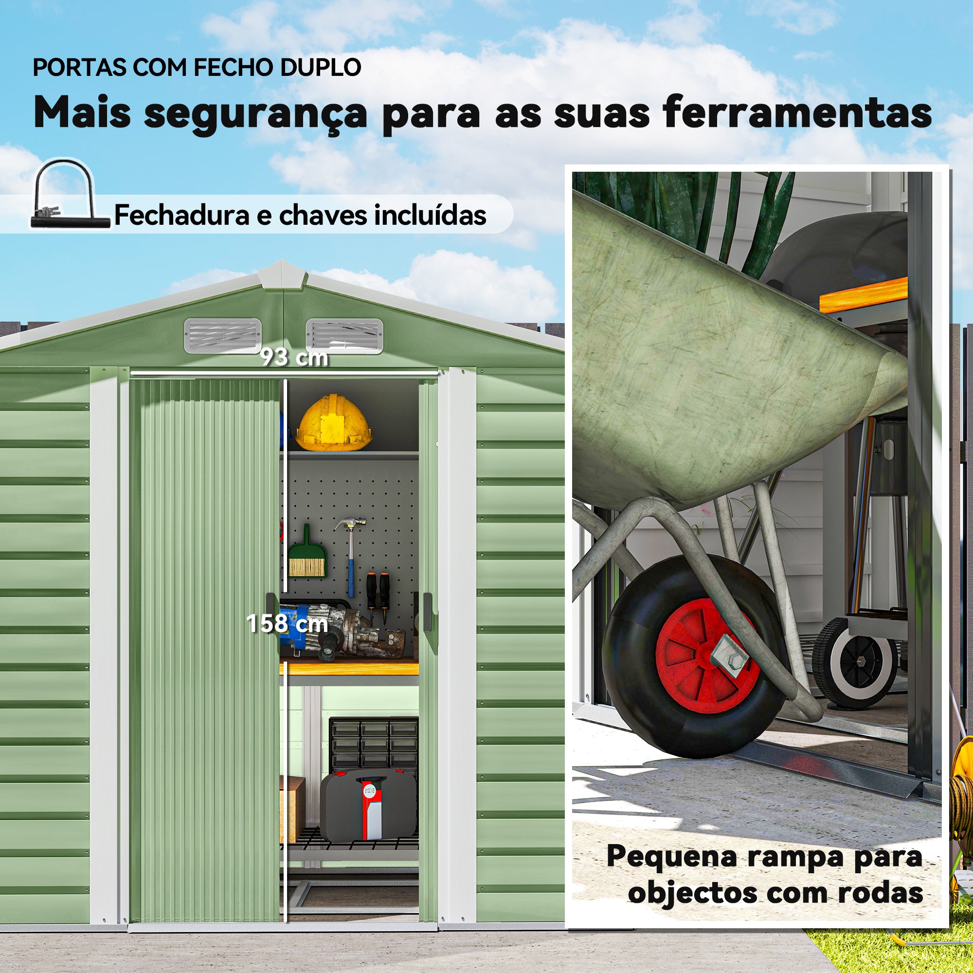 Abrigo de Jardim Exterior 2,36m² 213x120x194 cm Abrigo de Exterior com Base Reforçada (Piso NÃO Incluído) Portas de Correr Duplas Fechadura Janelas Verde Claro