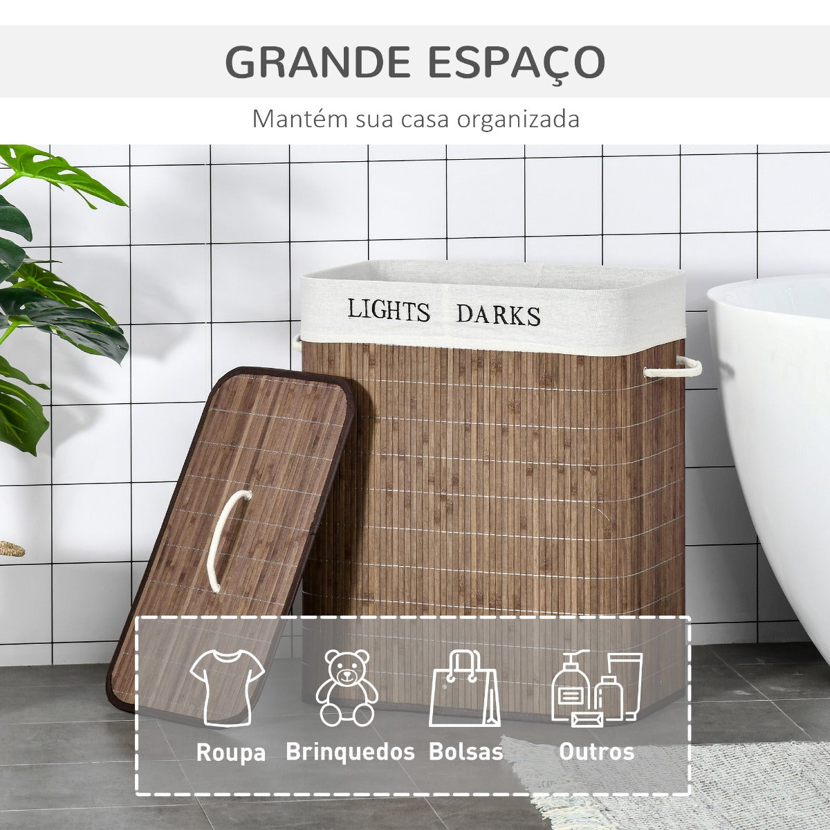 • MEDIDAS TOTAIS: 52x32x63cm (CxLxA); Medidas dos compartimentos: 26x33x58cm (CxLxA); Peso máximo suportado: 15kg. Requer montagem Este cesto para roupa suja de HOMCOM é a solução ideal para qualquer casa, ja que poderá ter toda a roupa suja junta e preparada para colocar na lavadora. Conta com uma estrutura resistente de madeira de bambú com alças para mover com facilidade e uma cesta de tecido, que se pode colocar e tirar e também se pode lavar e uma tampa. Além disso, também se pode utilizar como cesto de armazenamento para brinquedos, mantas, toalhas, etc