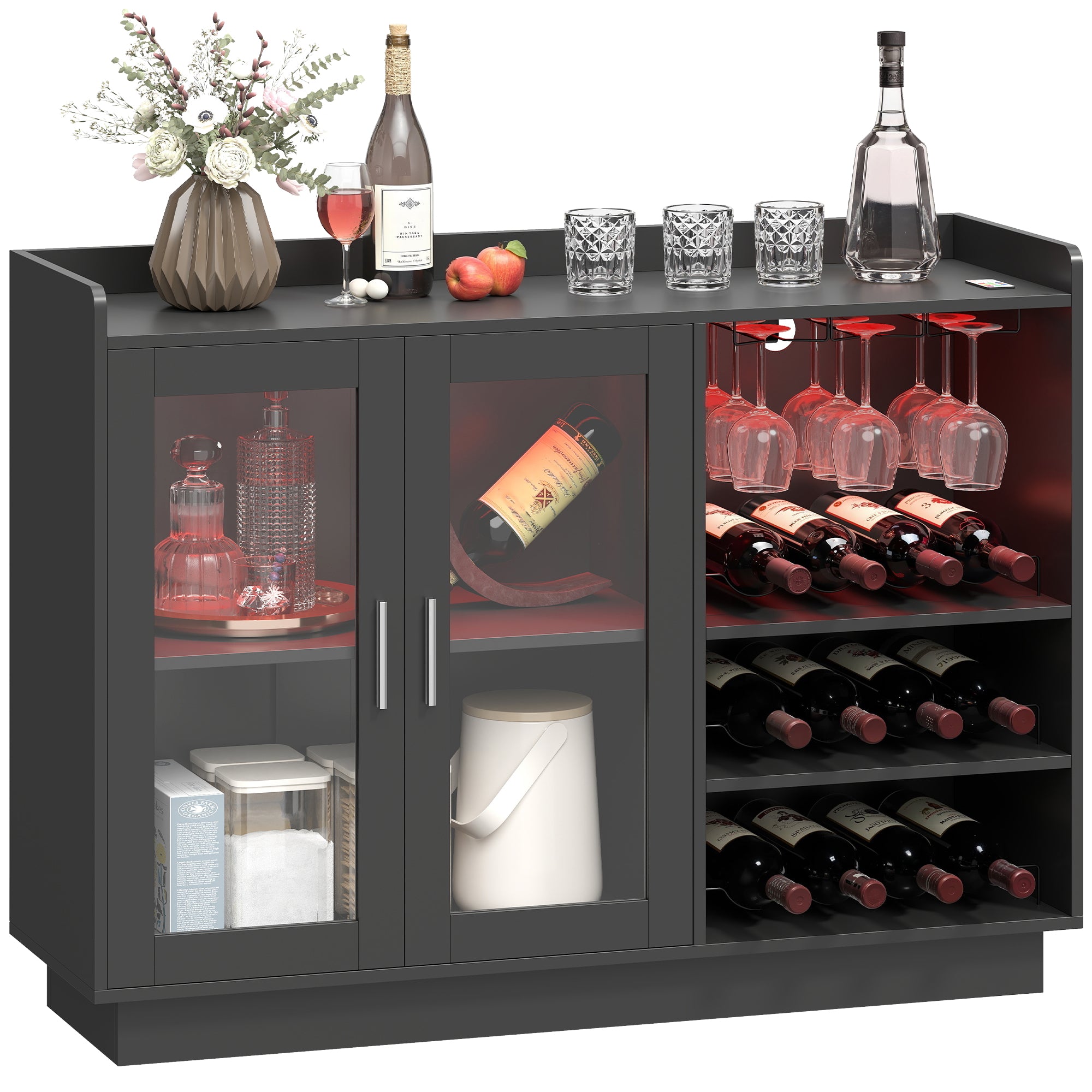 Móvel de Bar Armário Buffet para Vinhos com Luzes LED RGB, Porta-Garrafas para 12 Garrafas, Aparador de Cozinha com Prateleira Ajustável e Portas com Fecho Suave, Preto