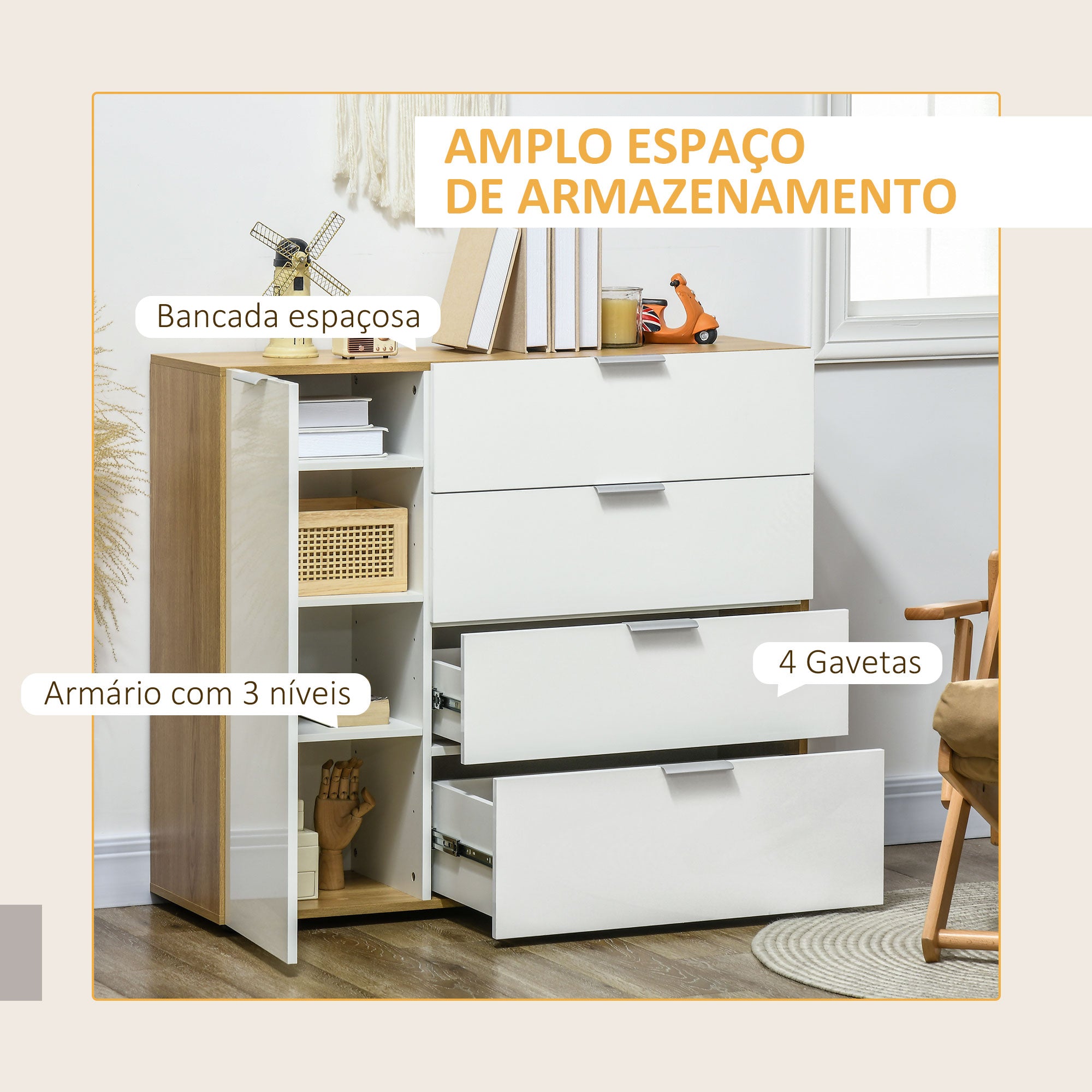 - MEDIDAS TOTAIS: 105x35x92 cm (CxLxA). Peso máximo suportado: 10 kg (bancada), 5 kg (prateleira/gaveta). Requer montagem Para dar um toque de modernidade à sua casa e manter tudo sempre em ordem, este armário da HOMCOM é a escolha certa para você. Este armário possui um armário de uma porta com prateleiras ajustáveis e quatro gavetas, oferecendo espaço suficiente para todos os seus itens. A combinação da cor branca com o grão natural da madeira confere um aspecto elegante à estrutura. Use este aparador na sala, no quarto ou na entrada de acordo com as suas necessidades