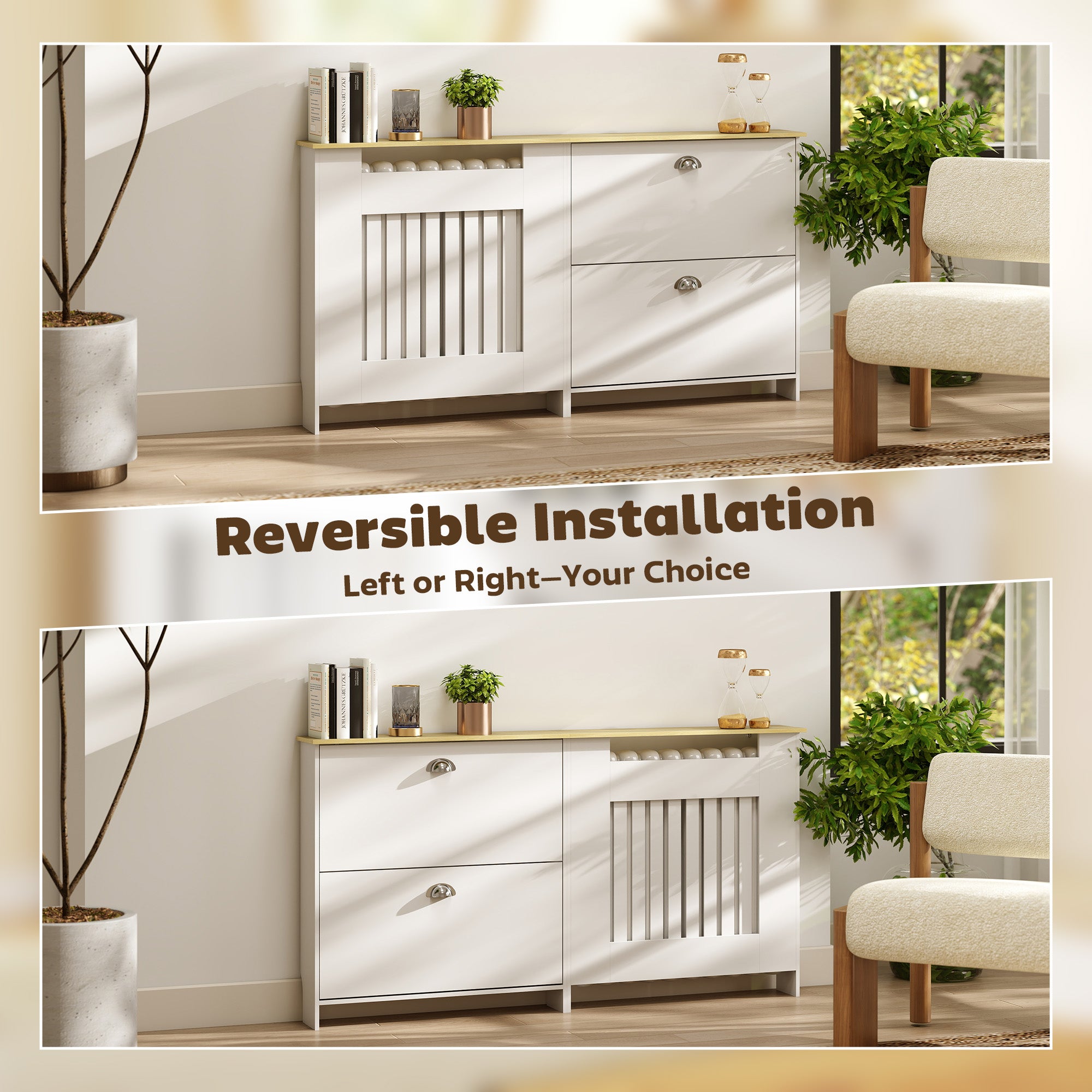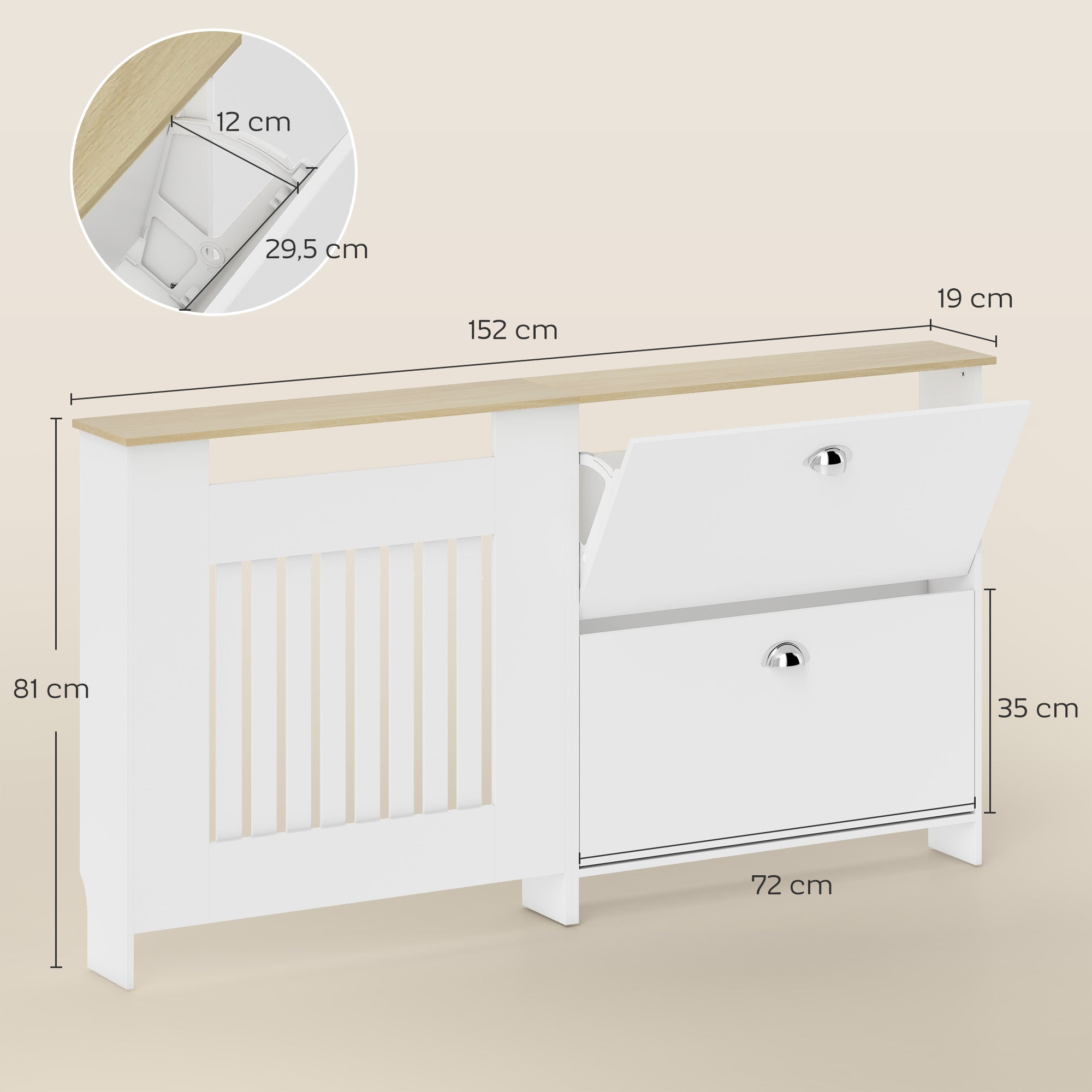 - 2 COMPARTIMENTOS ABATÍVEIS E PRATELEIRA SUPERIOR: Esta cobertura para radiador inclui 2 compartimentos abatíveis para guardar sapatos de forma prática e organizada, além de uma prateleira superior perfeita para expor plantas, velas ou fotografias