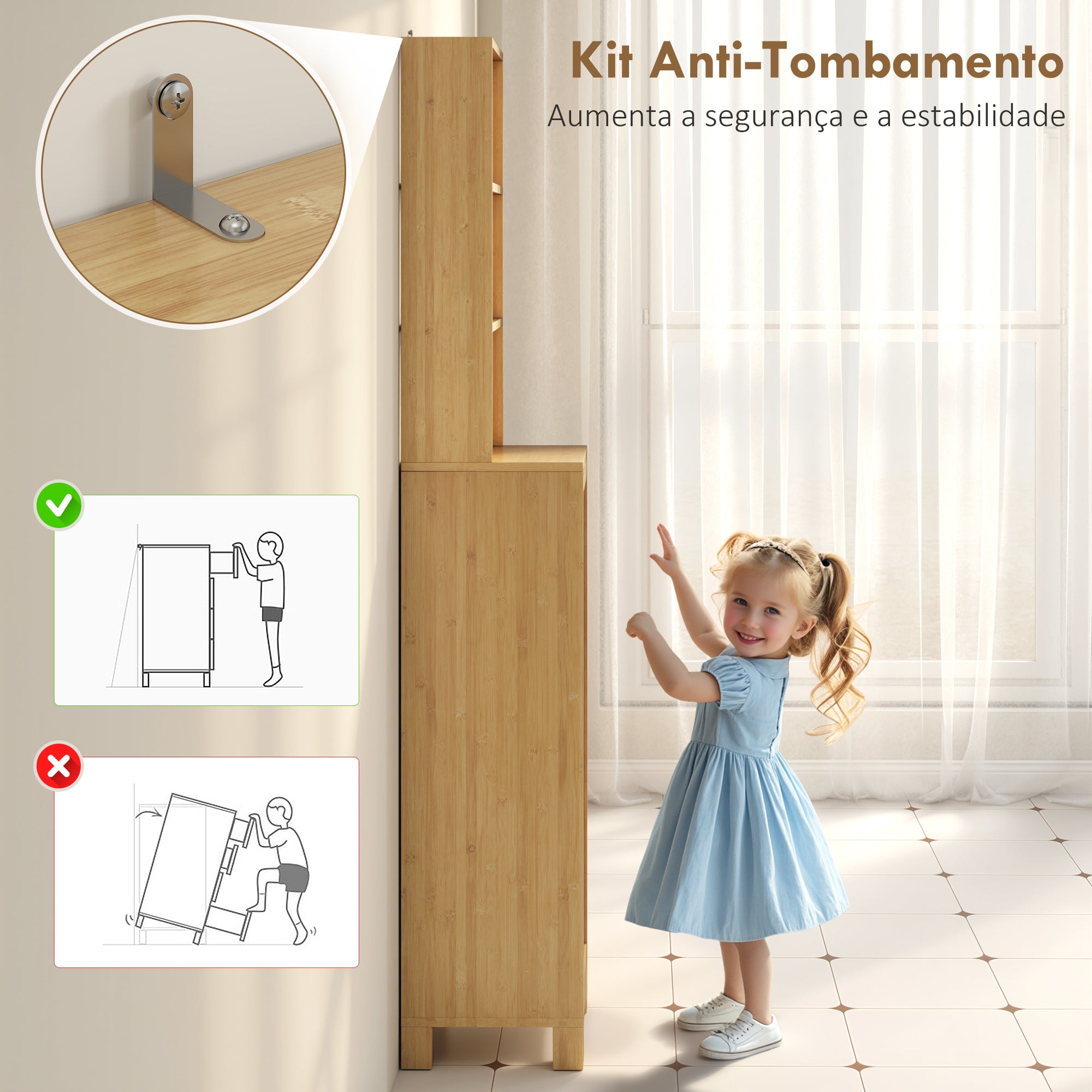 - Este armário alto de casa banho combina prateleiras abertas e fechadas para manter tudo organizado Esta coluna auxiliar de casa banho inclui prateleiras ajustáveis que se adaptam a diferentes tamanhos de objetos Fabricado em bambu natural resistente à humidade, com acabamento protetor durável Equipado com sistema antiviragem e pés antiderrapantes para maior estabilidade e segurança Porta com ripas que permite a ventilação interna e ajuda a manter os produtos frescos Design delgado tipo coluna de banho, ideal para banhos pequenos ou espaços reduzidos Requer montagem simples, com manual de instruções incluído