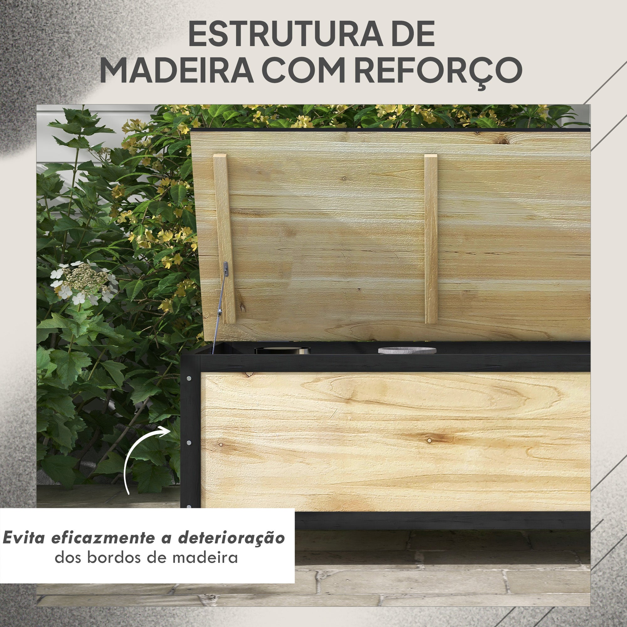 - ESTRUTURA DE MADEIRA COM REFORÇO DE AÇO: A sua estrutura de dupla camada previne eficazmente o deterioro desde as extremidades para a frente, garantindo uma longa vida útil