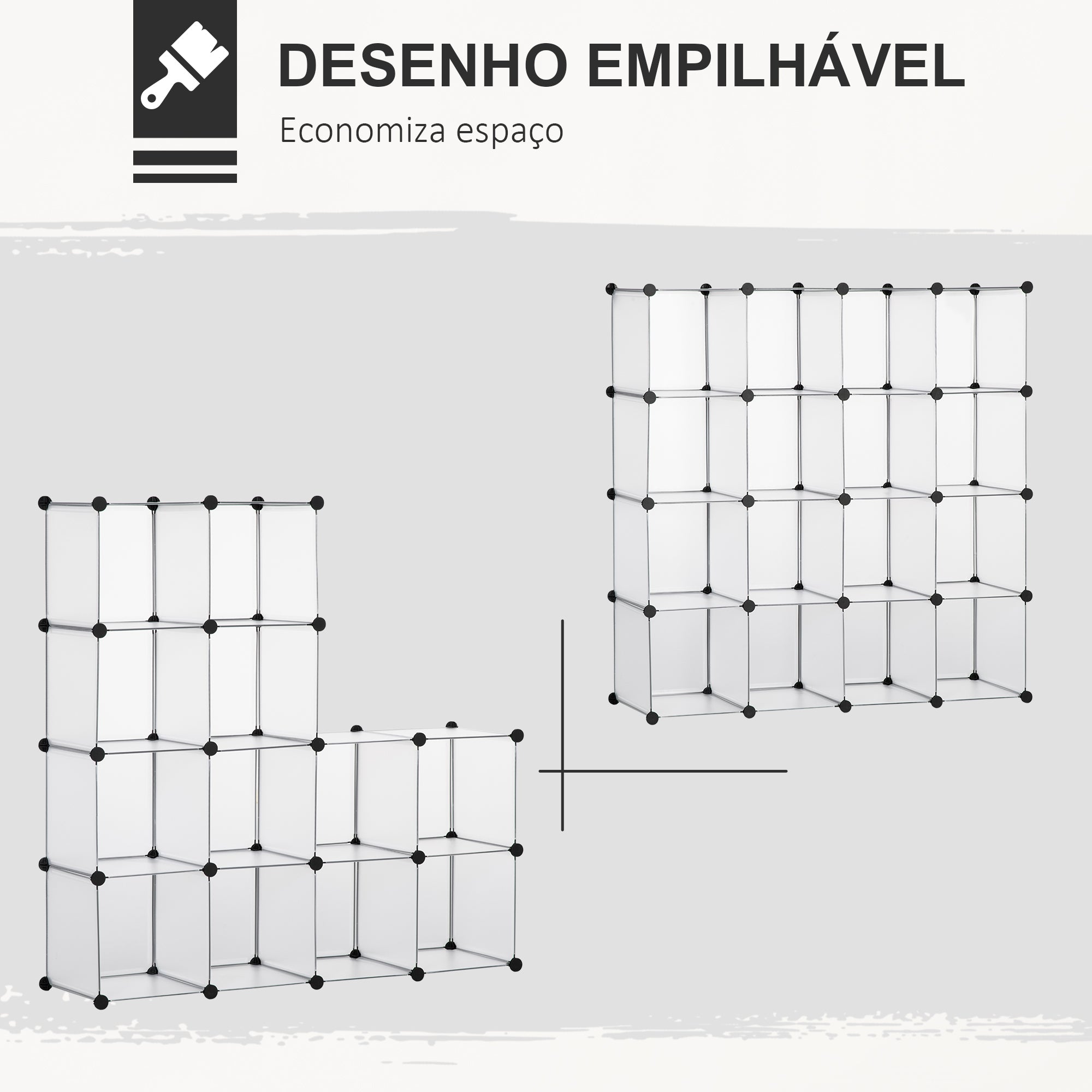 - MEDIDAS TOTAIS: 125x32x125 cm (CxLxA). Peso máximo suportado: 32 kg (total), 2 kg (cubo individual). Fácil de montar Organize eficientemente a sua casa com este armário modular de plástico da HOMCOM. Os cubos podem ser empilhados conforme a sua escolha, tornando·os ideais para se adaptarem facilmente a espaços de qualquer tamanho e forma. Os 16 cubos do armário modular oferecem muito espaço para guardar brinquedos, roupas, sapatos e outros objetos, mantendo a casa arrumada e organizada. Um ótimo acessório para o seu lar!