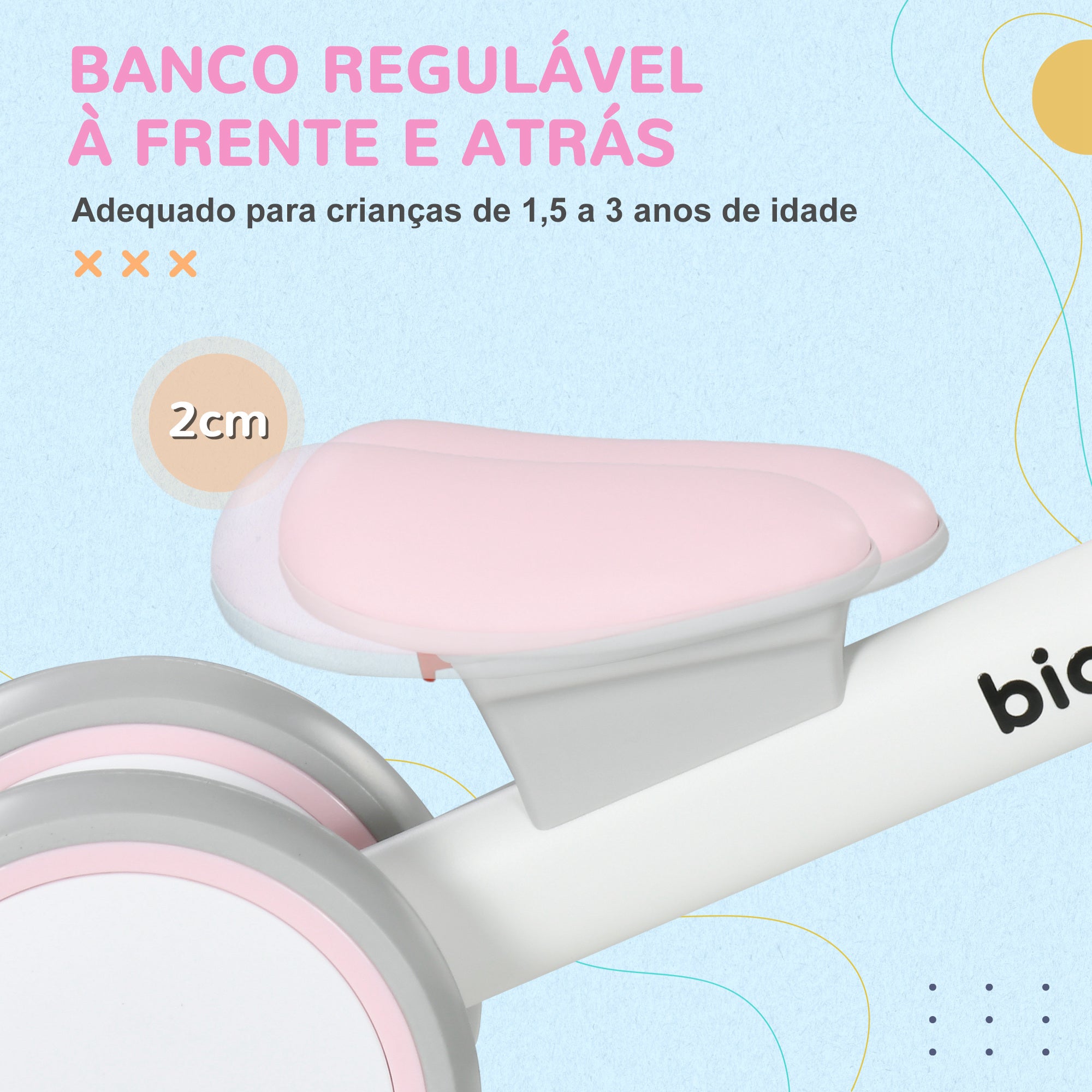 - Bicicleta sem pedais com uma bonita combinação de cores que encantará as crianças Ajuda a desenvolver a motricidade e melhorar o equilíbrio Assento ajustável, adequado para crianças de 1 a 3 anos Pneus silenciosos, ideais para uso tanto em interiores como no exterior Desenho seguro com rotação limitada do guiador e rodas fechadas Rodas totalmente fechadas para proteger os pés das crianças evitando assim acidentes Leve e fácil de transportar, ideal para passeios em família Requer montagem