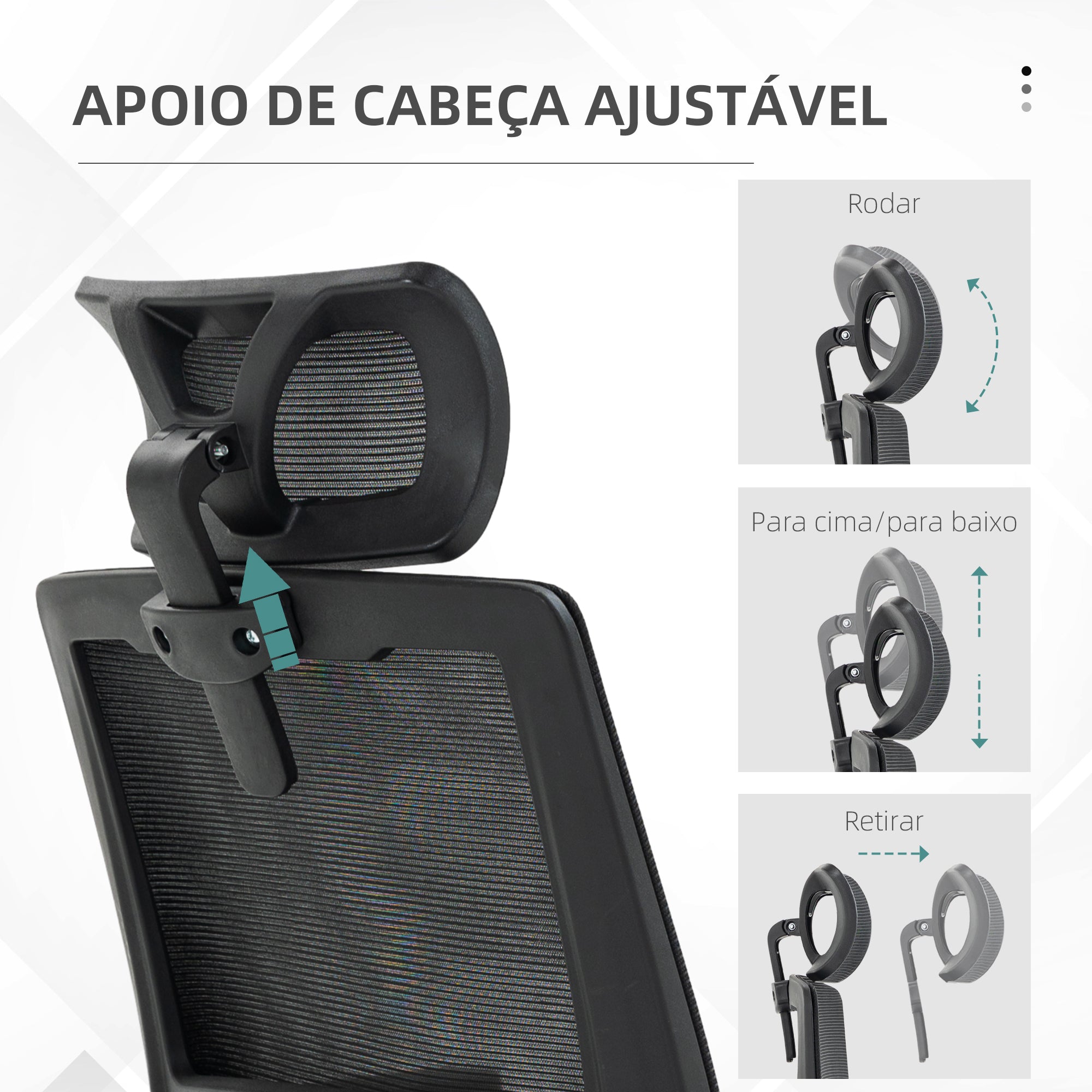 • Faça uma pausa e alonguese com função de inclinação Altura do assento ajustável para se adequar ao seu estilo de sentar O apoio lombar alivia a pressão na zona lombar O encosto de cabeça pode ser movido para cima ou para baixo, girado e é removível. Apoio para os pés retrátil para que possa descansar os pés enquanto relaxa Tecido em malha respirável e macio Rodas giratórias e assento garantem mobilidade fácil e rápida Requer montagem
