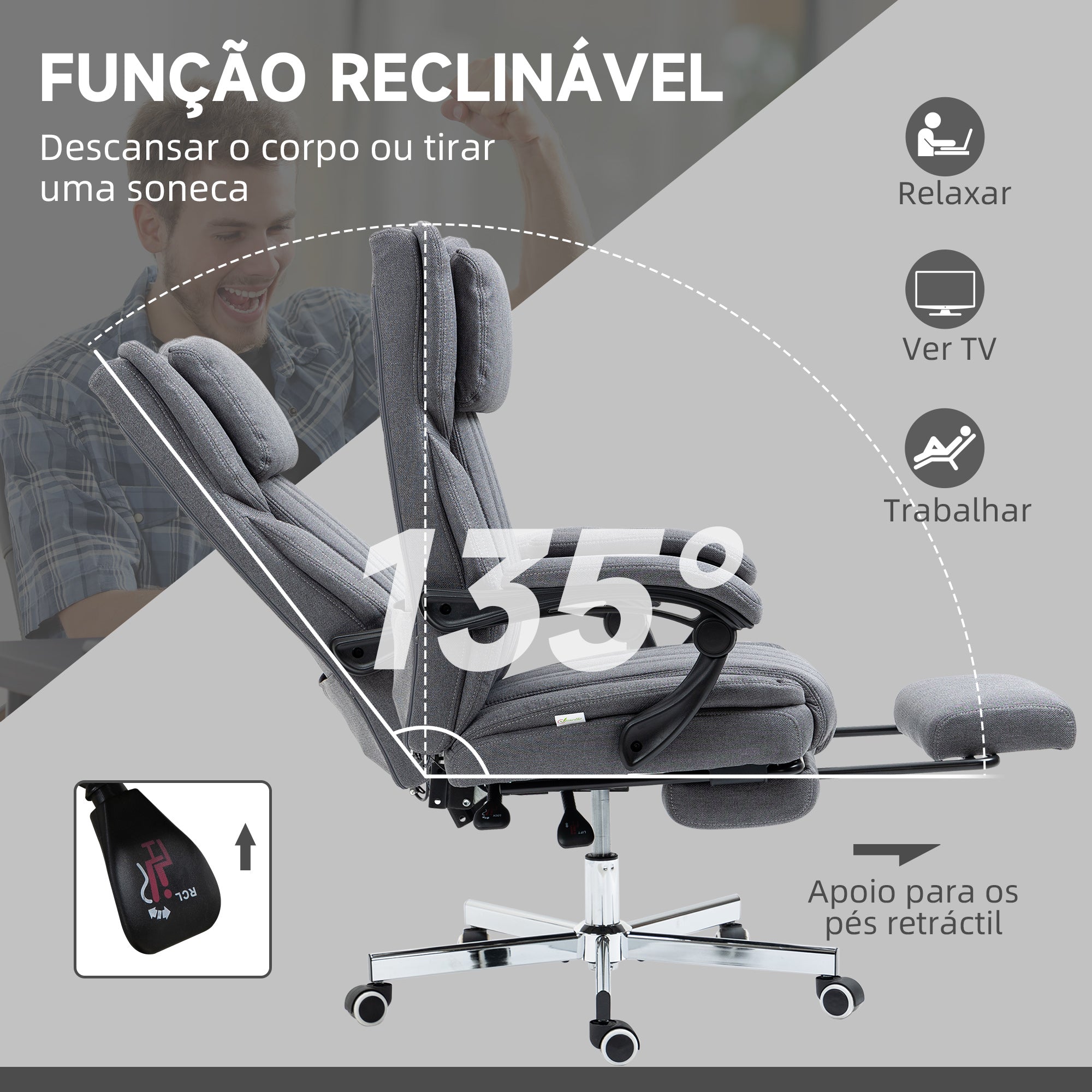 - MEDIDAS TOTAIS: 65x61x105·113 cm (CxLxA). Medidas do assento: 53x50x41·49 cm. Peso máximo suportado: 120 kg. Requer montagem Se procura uma cadeira cómoda para o seu escritório ou secretária, esta cadeira Vinsetto com apoio de pés retráctil e função de massagem é a melhor opção. Com base sobre rodas, elevador topo de gama, apoios de braços acolchoados e massagem vibratória, esta cadeira é ideal para trabalhar e descansar ao mesmo tempo. Para aliviar a tensão após um longo dia de trabalho ou para fazer uma pausa e poder relaxar. Além disso, o encosto reclina até 135º, para que você possa até tirar uma soneca
