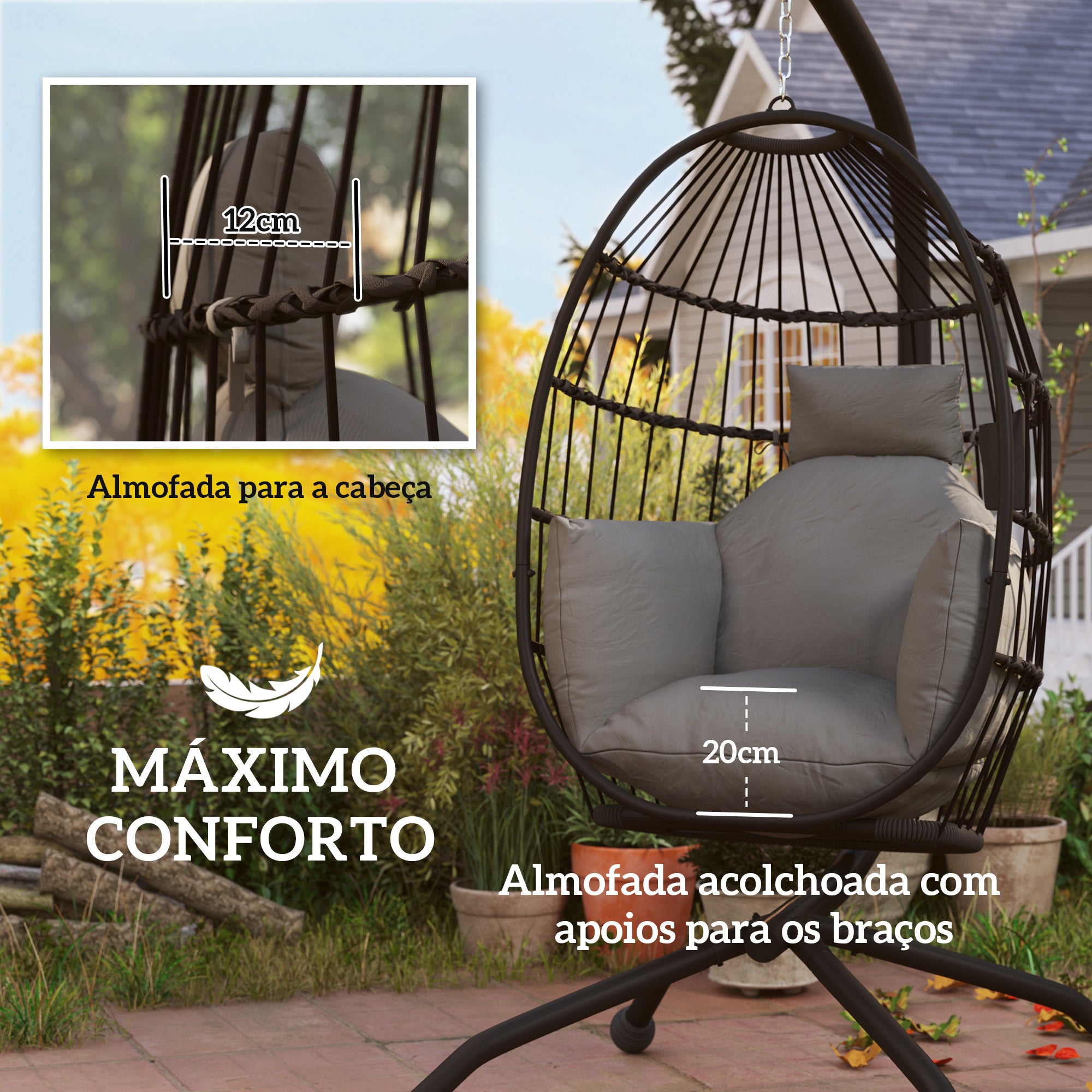 • Cadeirão suspenso em forma de ovo imita um ninho de pássaro, com um assento largo Esta cadeira em forma de ovo com um desenho aberto tecido em corda oferece um atrativo visual O cesto pode ser dobrado para ser guardado quando não estiver a ser utilizado, com um suporte para copos Almofada espessa de 20 cm e almofada de cabeça de 12 cm, todas com capas com fecho de correr, para um conforto luxuoso A corrente superior é ajustável para se adaptar à altura ideal do baloiço A corrente superior é ajustável de acordo com a altura ideal do baloiço A fixação segura o cesto para evitar movimentos excessivos Requer uma montagem simples
