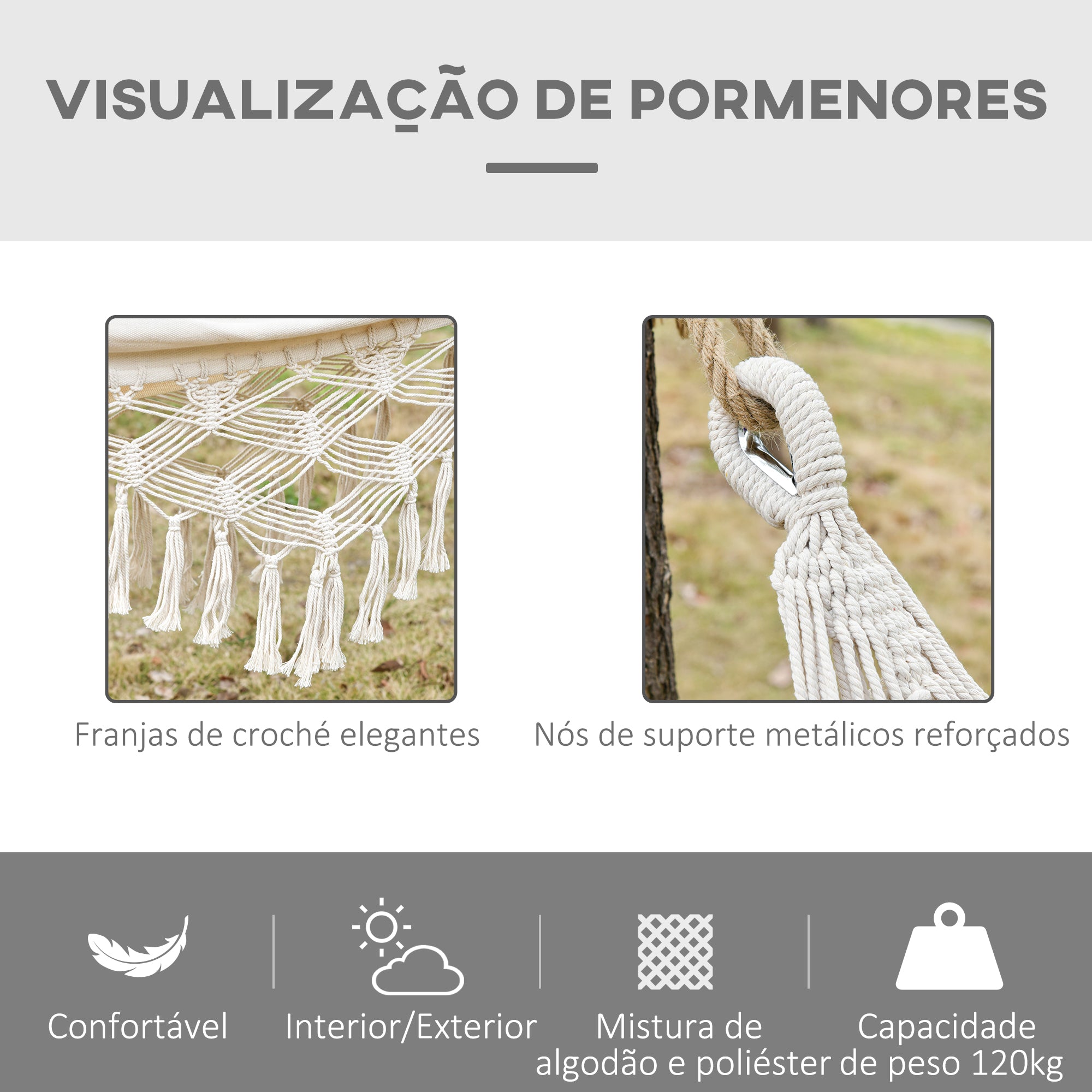 - MEDIDAS TOTAIS: 288x150 cm (CxL). Medidas da tela da cama: 200x150 cm (CxL). Comprimento das borlas: 35 cm. Peso máximo suportado: 180 kg Já viu esta rede de estilo boémio da Outsunny? Ideal para desfrutar de uma tarde ao sol ou relaxar com um bom livro à sombra das árvores ou num suporte para redes (não incluído). Feita em tecido de algodão e poliéster com fortes nós de corda em cada lado e argolas de metal, suporta até 180 kg. E inclui uma bolsa para que a possa levar para qualquer lugar