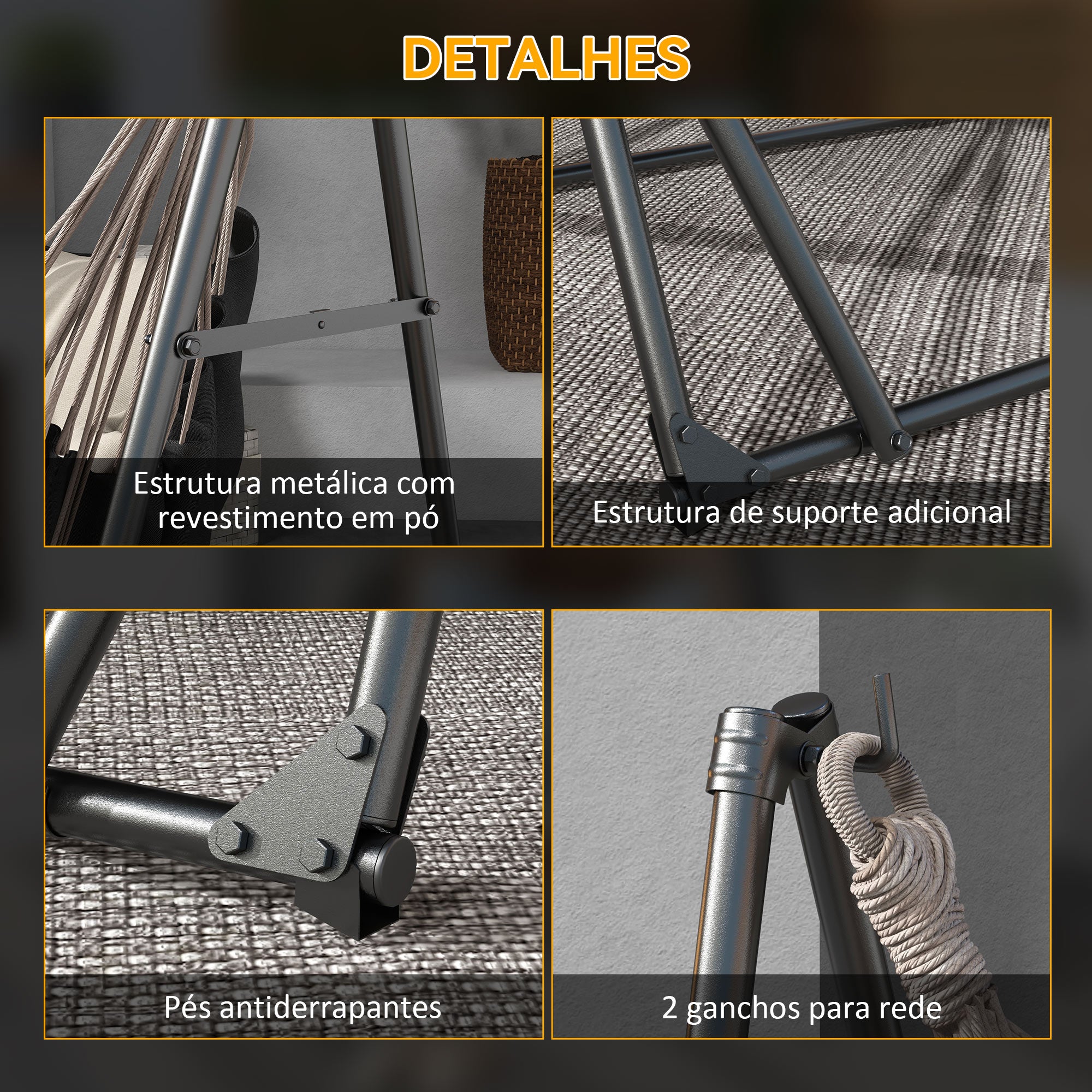 • MEDIDAS TOTAIS: 268x89x100 cm (CxLxA), medidas dobradas: 127x20x16 cm (CxLxA), carga máxima: 120 kg. Este suporte para redes requer montagem. O pacote inclui: ? 1 x Suporte para rede; ? 2 x Gancho; ? 1 x Bolsa de transporte; ? 1 x Manual de instruções Pendure a sua rede em qualquer lugar sem necessidade de árvores, graças a este suporte da Outsunny. Fabricado em metal com revestimento em pó, proporciona grande resistência e durabilidade. Este suporte 2 em 1 pode ser facilmente transformado de suporte para rede de descanso para suporte de cadeira suspensa. O design dobrável facilita o armazenamento e transporte. Seguro, estável e resistente às intempéries, é ideal para uso exterior durante todo o ano enquanto relaxa.