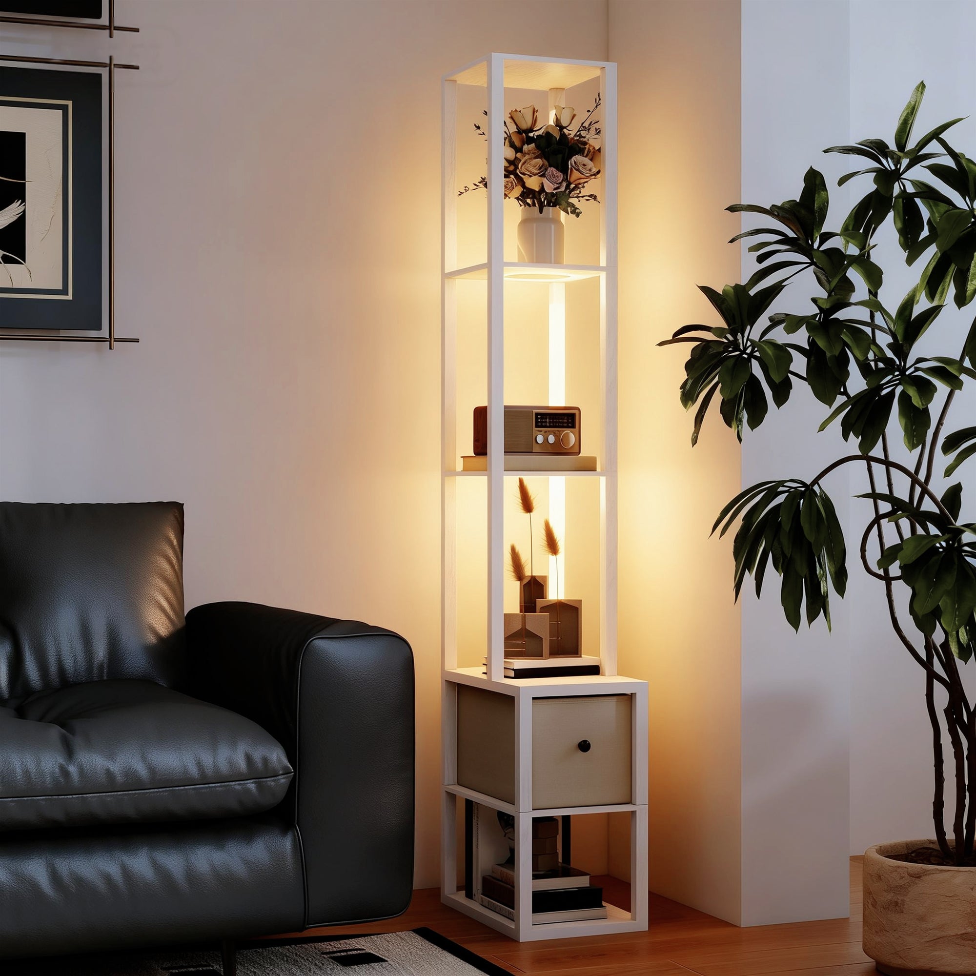 - FUNCIONALIDADE 3 EM 1: Este elegante candeeiro de pé combina iluminação LED de tonalidade quente, prateleiras para livros ou elementos decorativos e uma gaveta dobrável em tecido — uma solução multifuncional que alia luz, arrumação e design compacto