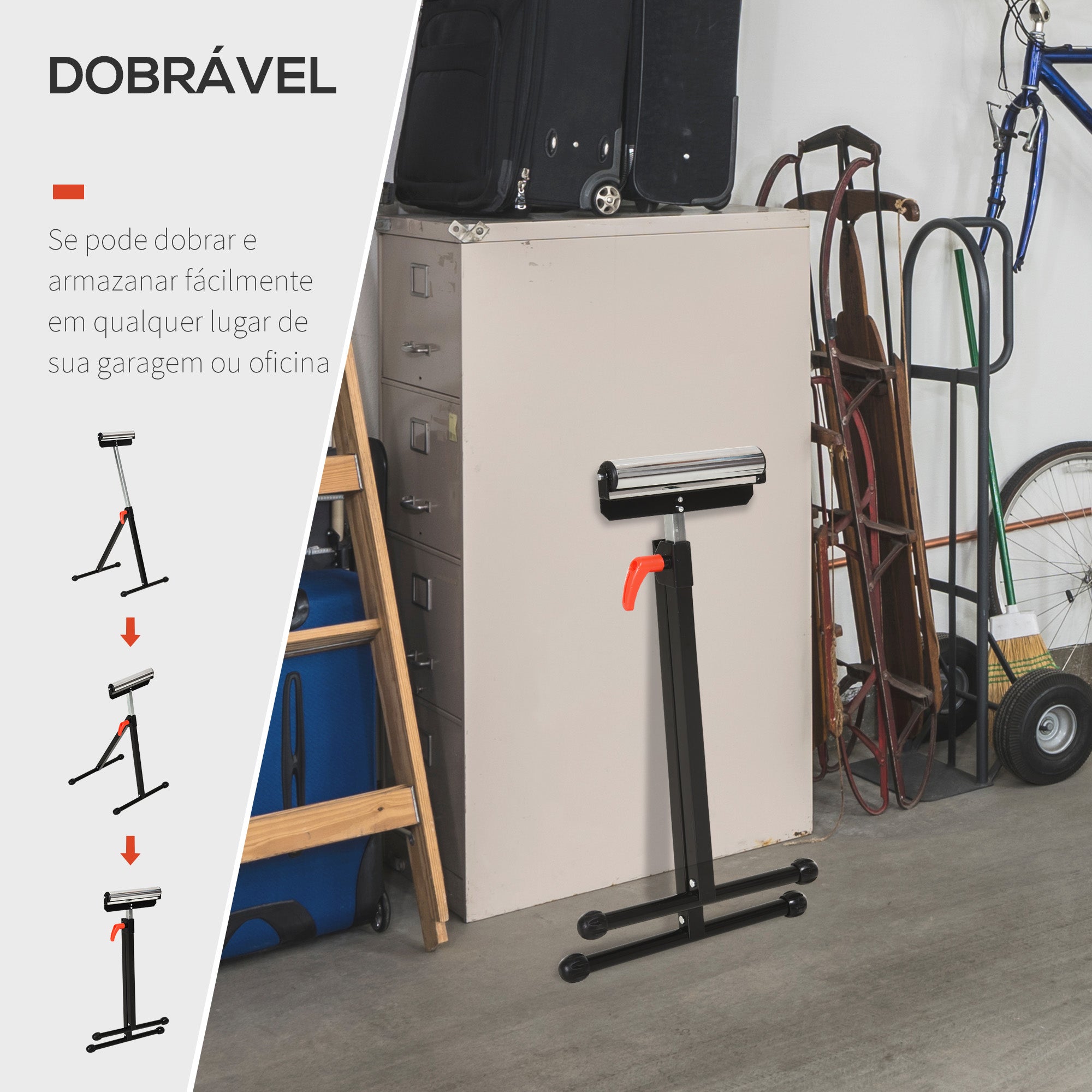 - MEDIDAS TOTAIS: 44x50x68-110cm (CxLxA); Medidas dobrada: 44x6,5x76cm (CxLxA); Capacidade de carga: 60 kg (altura máxima), 90 kg (altura mínima) Este suporte de rolo de HOMCOM é ideal para trabalhos em madeira e metal, para aguentar e mover as peças pesadas e volumosas. Indispensável para qualquer oficina ou carpinteria. O rolo com rolamento proporciona um funcionamento suave, e seu punho telescópico pode ajustar a altura para maior conforto. Fabricado de metal com revestimento em pó resistente a oxidação, é dobrável e leve para armazenar e transportar facilmente