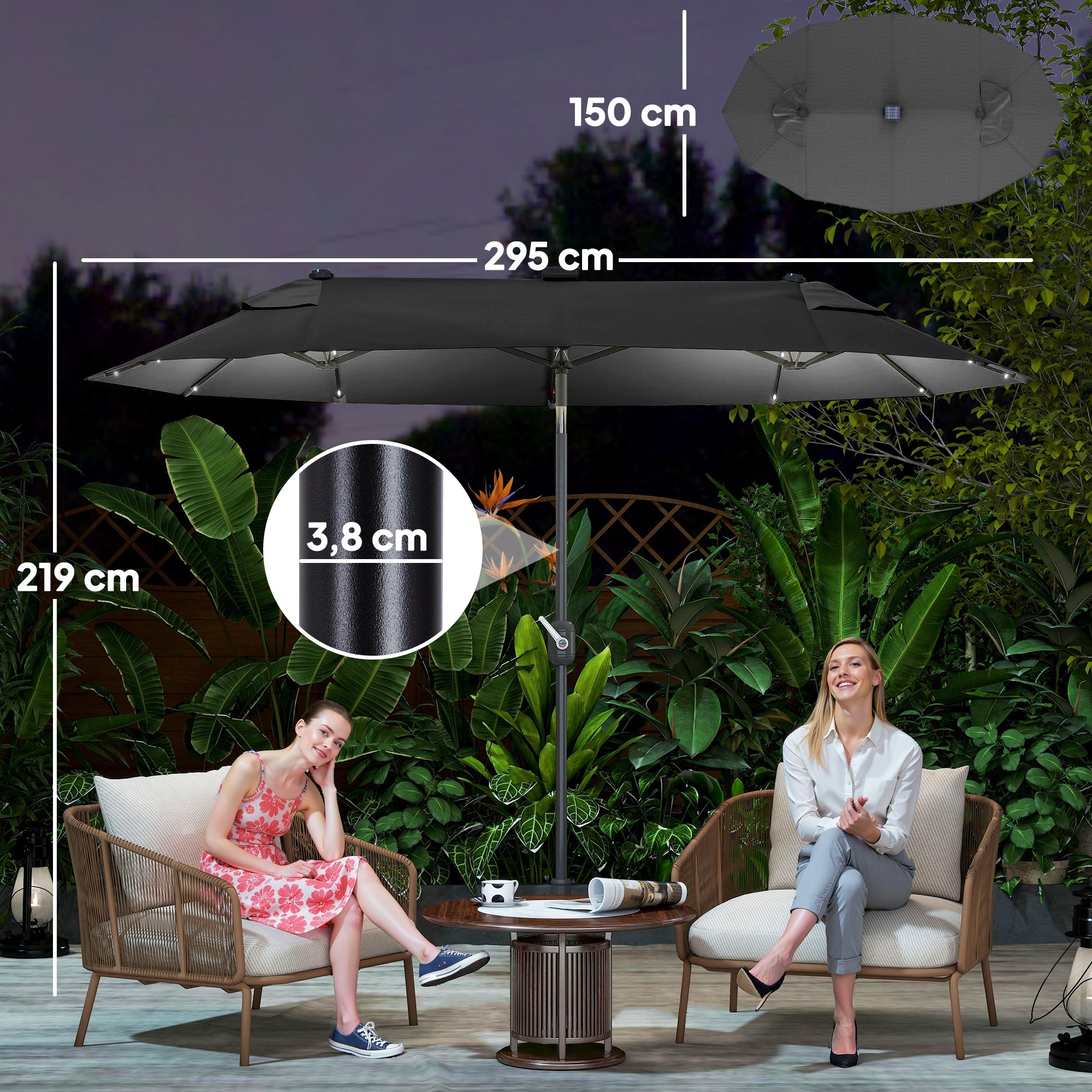 • LUZ LED E PAINEL SOLAR: Este chapéu de sol duplo possui um painel solar de alta eficiência energética e 35 luzes LED, para iluminar e decorar as noites ao ar livre. Possui um interruptor no mastro para ligar e desligar as luzes conforme as suas necessidades e uso