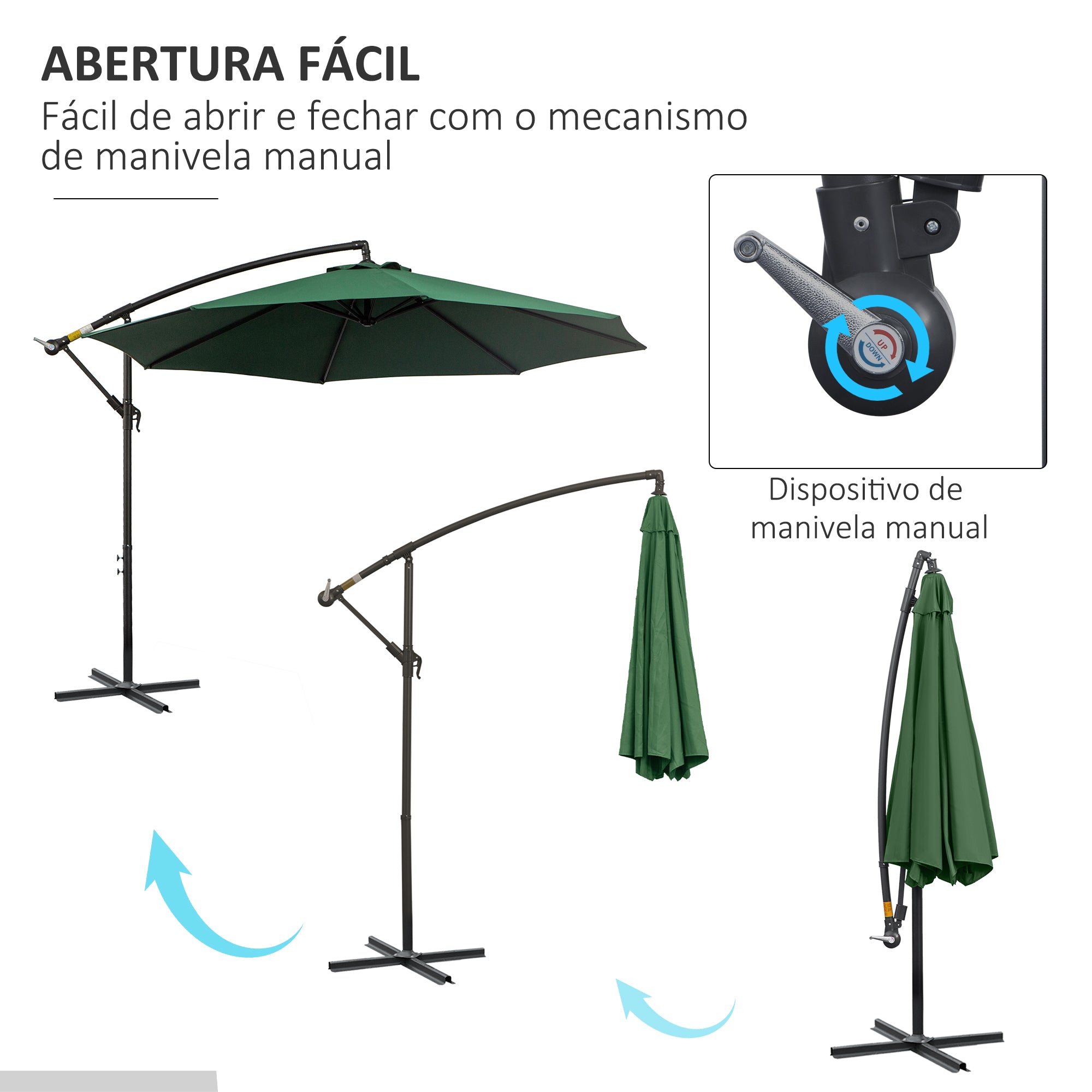 • ABERTURA E FECHAMENTO A MANIVELA: Chapéu de sol muito fácil de usar graças a seu mecanismo de abertura e fechamento mediante manivela manual. A manivela está situada no mesmo mastro pelo que será muito fácil de utilizar e regular segundo suas necessidades