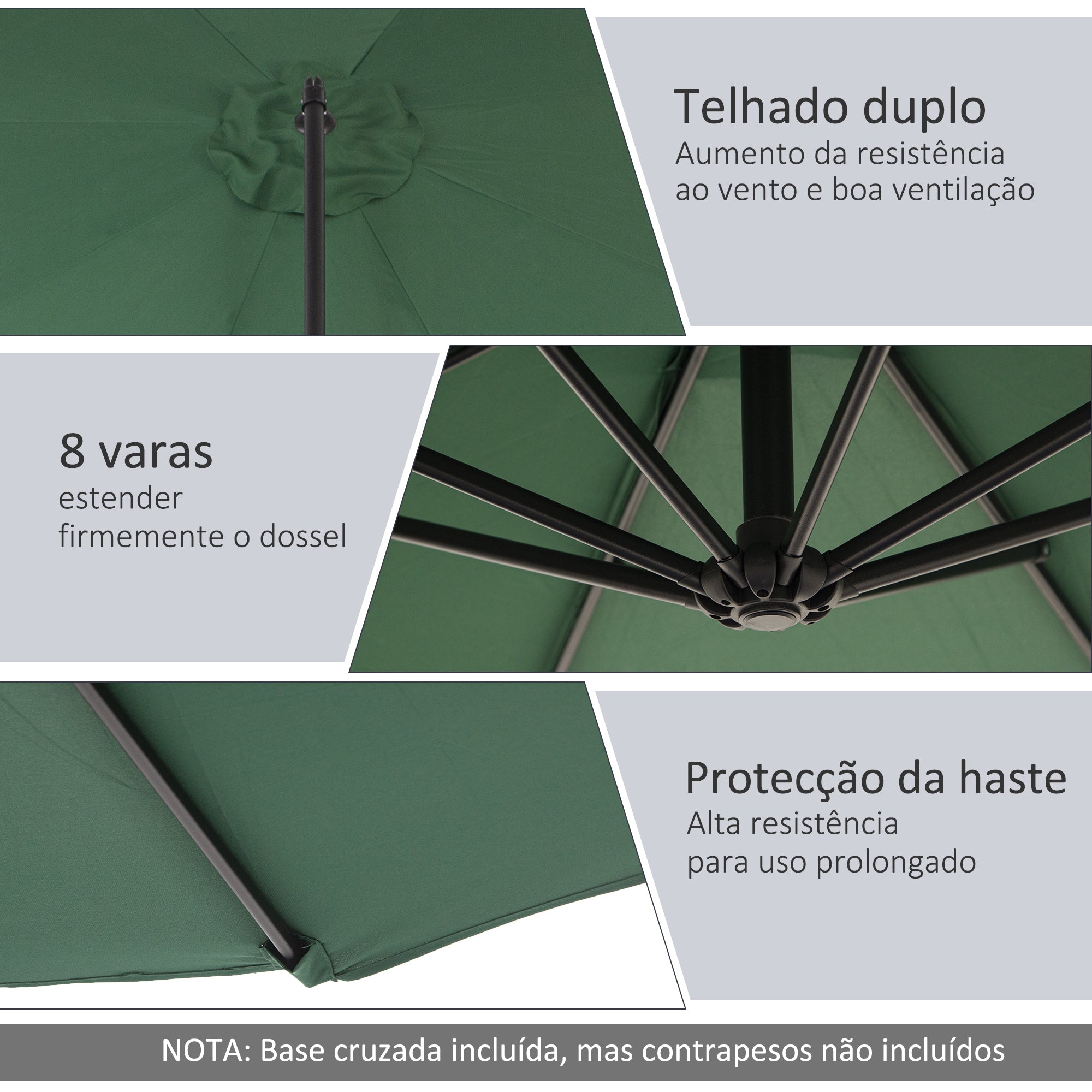 • Cor: verde Material: Aço, tecido de poliéster Medidas totais: Ø295x245cm (DxA) Medidas da base: 90x10x4,5cm (CxLxA) Medidas das hastes: Ø42x0,8mm Diâmetro do mastro: Ø48mm Referência: 84D·037GN