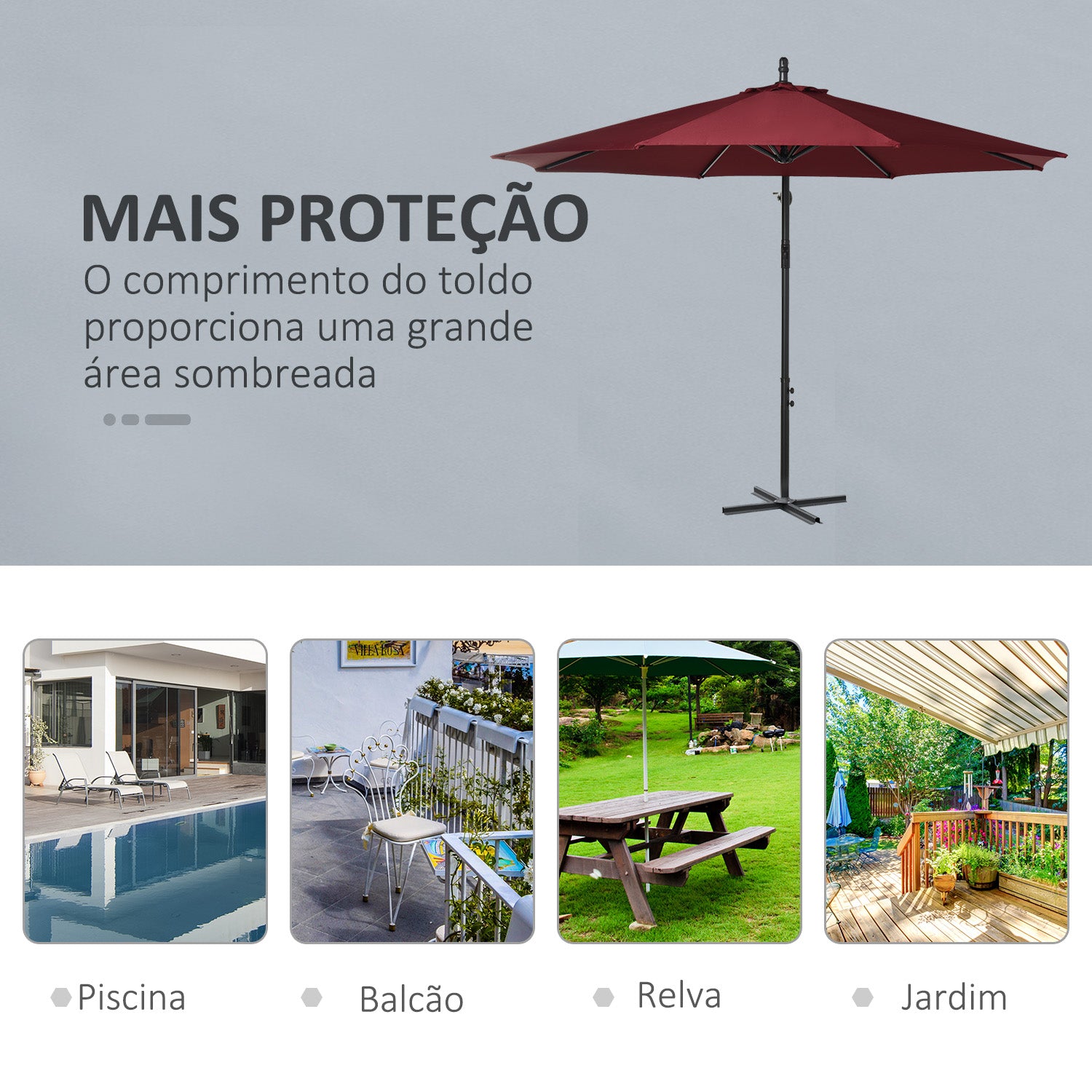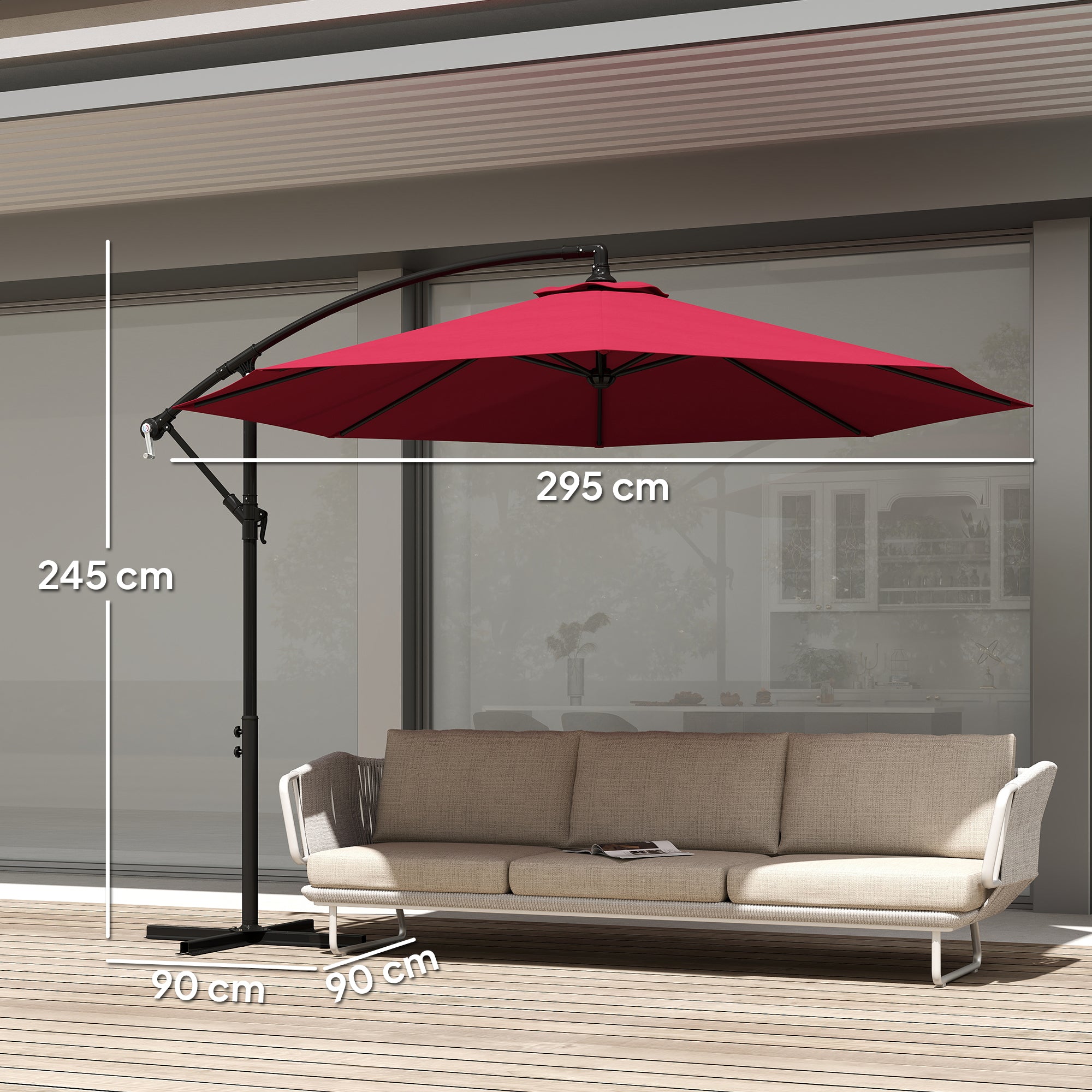 - Cor: Vinho Material: Aço e tecido de poliéster Medidas totais: Ø295x245 cm (DxA) Medidas da base transversal: 90x10x4,5 cm (CxLxA) Diâmetro do mastro: Ø48 mm Referência: 84D·037WR O pacote inclui: