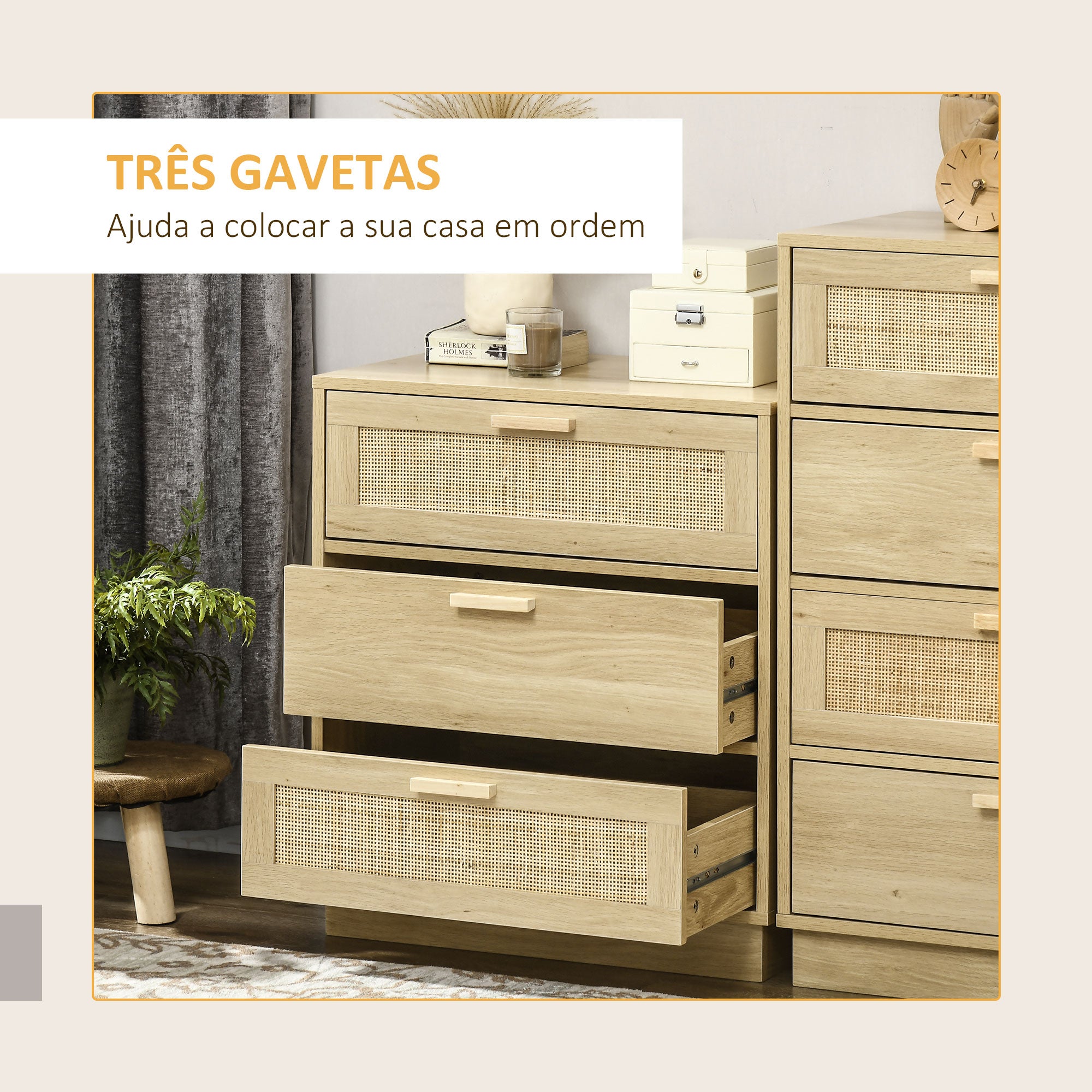 • Cómoda de estilo cannage que se destaca pelo seu design boémio e estética natural A bonita combinação de gavetas com a parte frontal de vime e outras não, que acrescentará um toque de elegância a onde a coloque 3 gavetas oferecem um amplo espaço para pijamas, meias, brinquedos ou outros itens do dia a dia A ampla bancada pode ser utilizada para exibir as suas decorações favoritas, quadros com fotos, candeeiro de mesa, entre outro Os puxadores facilitam a abertura e fechamento das gavetas Fabricada em melamina de madeira resistente, ideal para uma utilização prolongada Conta com um sistema antitombo para maior estabilidade e segurança Fácil de limpar com um pano húmido Requer montagem