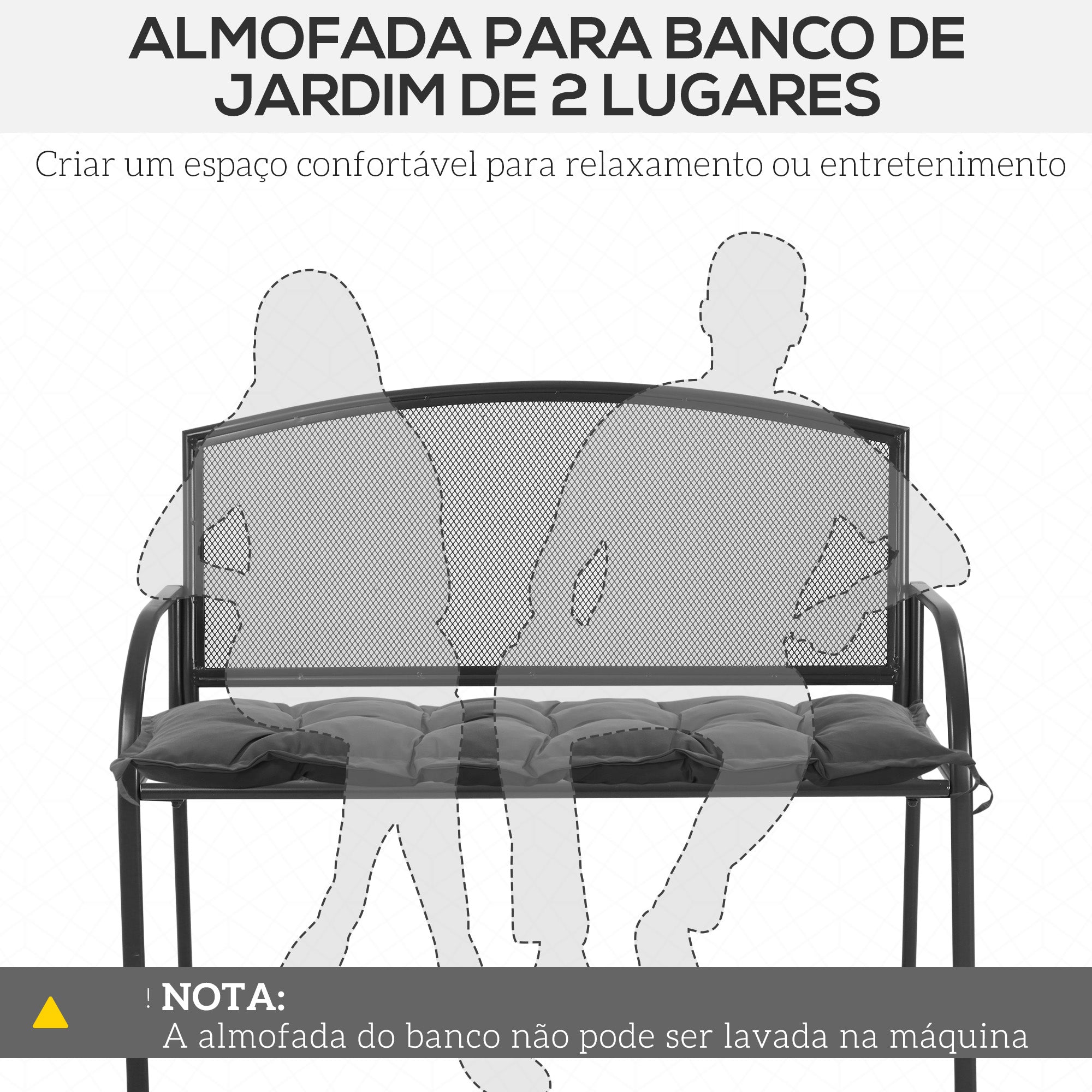 - Esta almofada para banco de exterior é ideal para renovar um assento desgastado ou adicionar um extra de conforto ao seu jardim ou varanda Tem um design acolchoado estilo Chesterfield, que traz um toque elegante e decorativo Conta com um enchimento de 10 cm de espessura, garantindo um assento confortável e macio É feita de poliéster de alta qualidade com uma densidade de 200 g/m², resistente e durável Inclui 8 cordas de fixação para prendê·la firmemente ao encosto do seu banco ou baloiço É perfeita tanto para interiores como para exteriores