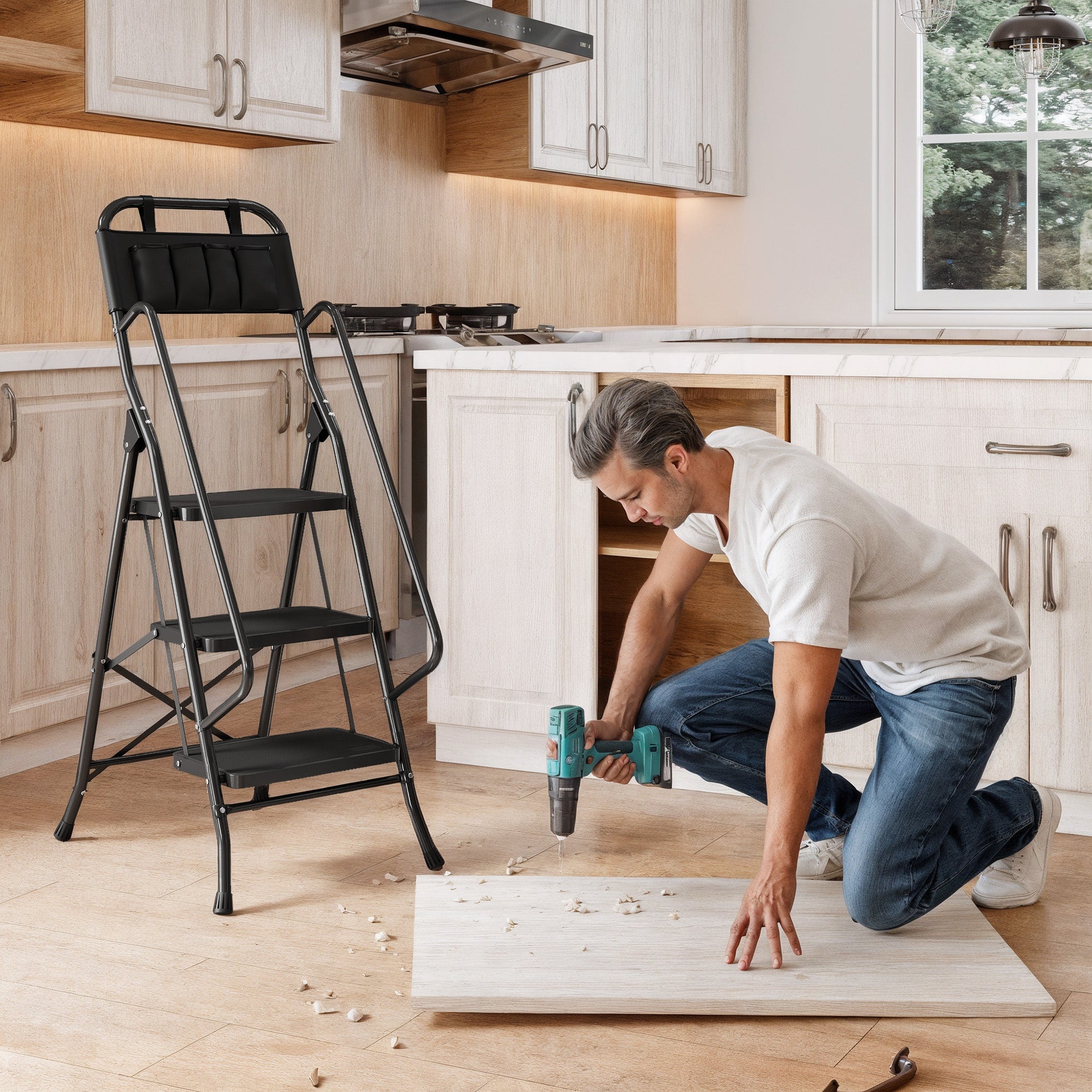 - PORTA FERRAMENTAS INCLUÍDO: Esta escada dobrável tem um bolso para ferramentas na parte superior, muito prático para realizar confortavelmente suas tarefas de bricolage ou jardinagem sem ter que se abaixar e ter tudo à mão