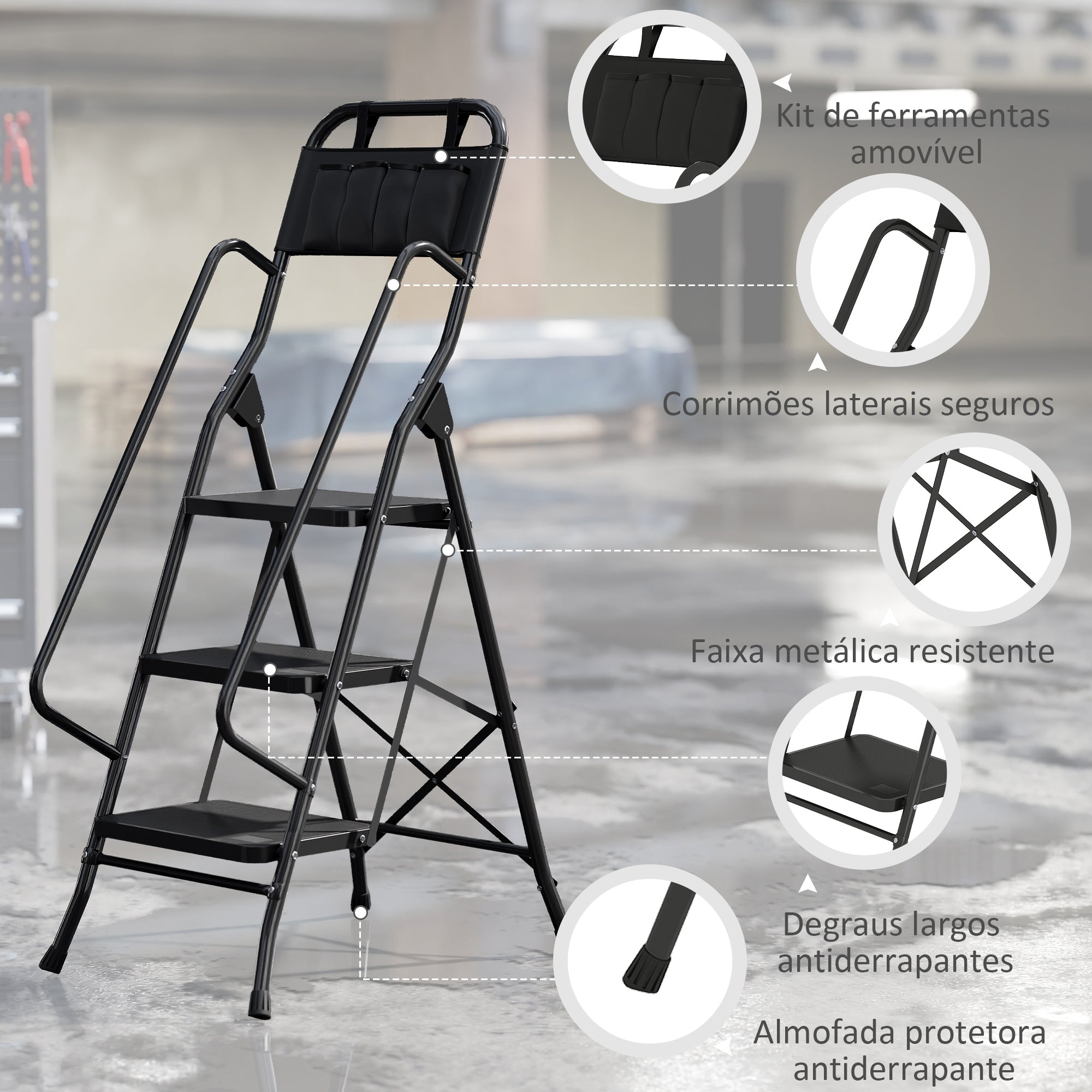 - Escada de aço resistente com grande estabilidade para sua segurança ideal Portátil e dobrável para economizar espaço de armazenamento Equipado com sistema de travamento para perfeita estabilidade na posição desdobrada Os 3 degraus antiderrapantes irão ajudá·lo a alcançar espaços altos de forma rápida e fácil Trilhos laterais Bolsa para guardar ferramentas como chaves de fenda, pregos, chaves, escovas Pés com almofadas de borracha antiderrapante para maior segurança e estabilidade Muito prático, adapta·se a todas as situações do quotidiano: limpeza, bricolagem, jardinagem, etc.