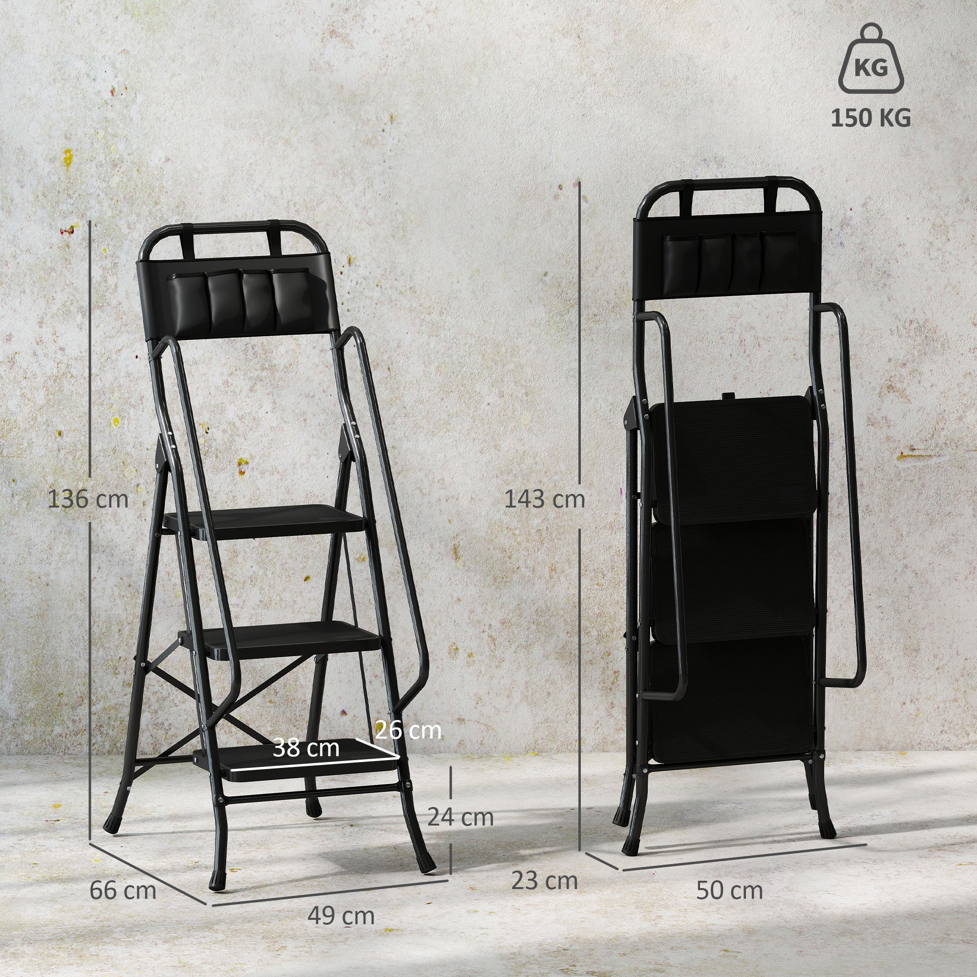 Escada Dobrável com 3 Degraus Escada de Metal com Apoio para os Braços e Suporte para Ferramentas Carga Máxima 150 kg 49x66x136 cm Preto