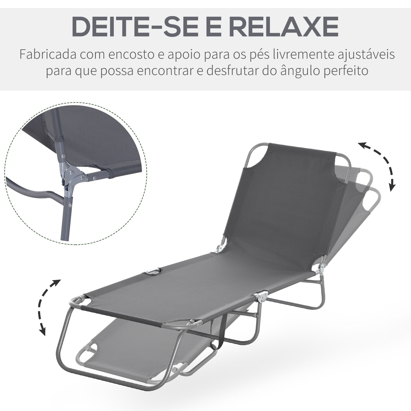 - MEDIDAS TOTAIS: 187x55x24 cm (CxLxA). Altura do assento: 24 cm. Medidas quando a espreguiçadeira ajustável está dobrada: 65x55x12 cm. Peso máximo suportado: 120 kg Elegante e compacta, esta espreguiçadeira Outsunny proporciona o local ideal para relaxar ao sol. Pode·se ajustar facilmente o encosto e o apoio para os pés para encontrar a melhor inclinação. Este desenho dobrável de 3 secções permite armazenar a espreguiçadeira num espaço reduzido, e graças à prática pega, pode ser transportada facilmente para onde se desejar. Seja para planejar um dia de descontração no jardim ou na praia, esta espreguiçadeira Outsunny será a companheira perfeita