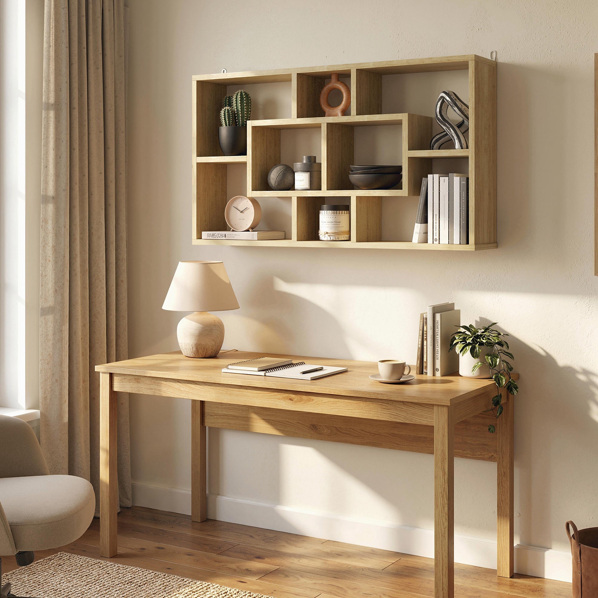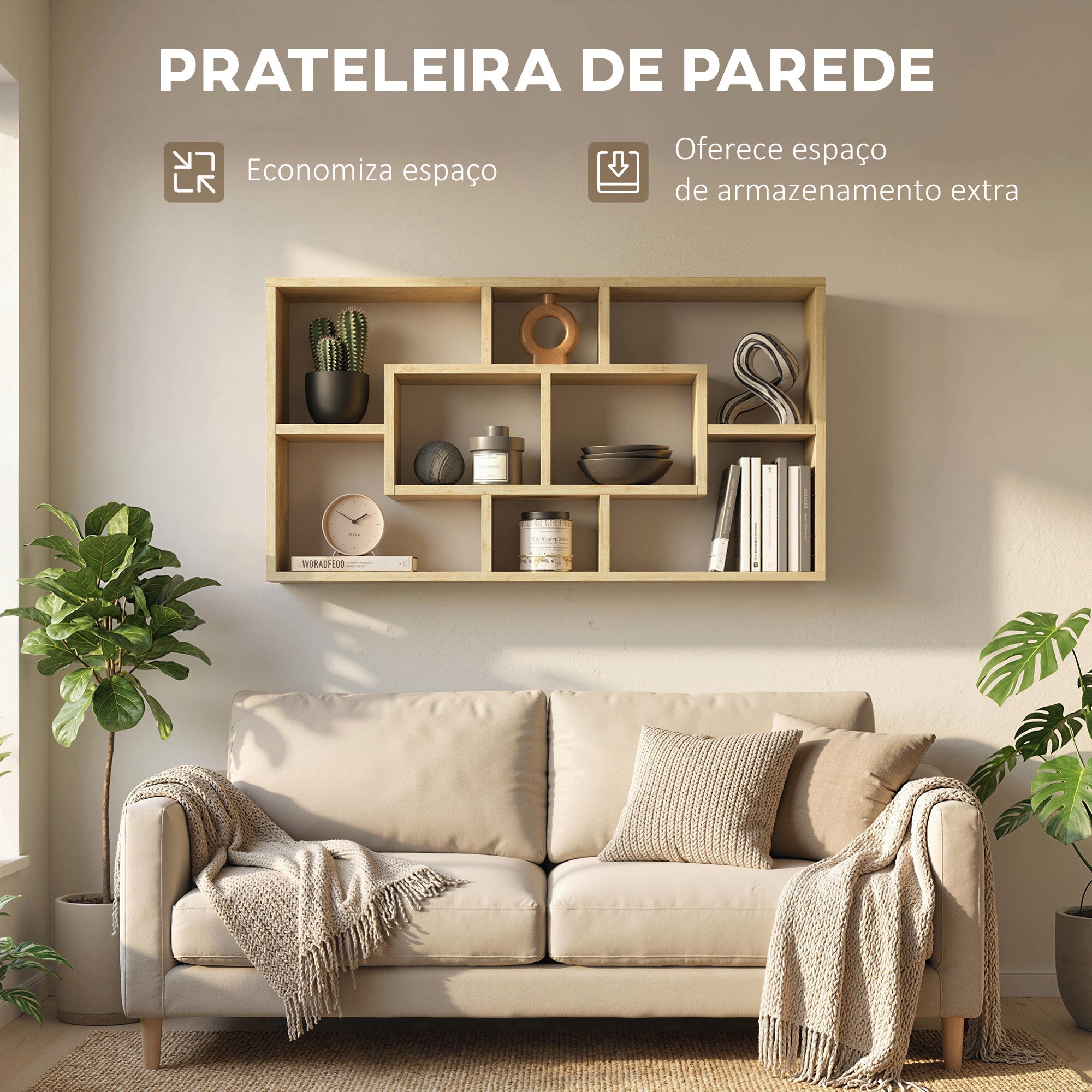 - Design moderno e elegante, ideal para sala de estar, entrada, quarto, entre outros Compacta e prática, pode ser montada na parede para economizar espaço no chão Inclui 8 compartimentos de 3 tipos e tamanhos diferentes para organizar e exibir objetos essenciais do dia a dia Equipado com sistema anti·queda, permitindo fixação na parede para maior segurança Construção em madeira melamínica de alta qualidade, garantindo durabilidade e estabilidade Montagem simples e rápida