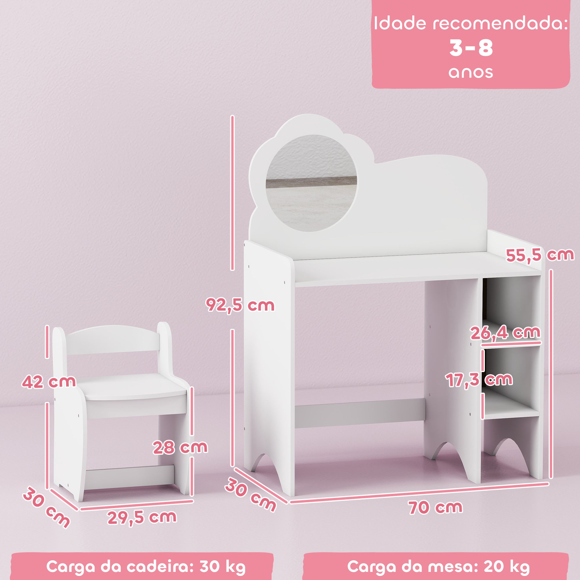 • Cor: branco Material: MDF, acrílico Medidas totais da mesa: 70x39x92,5 cm (CxLxA) Medidas totais da cadeira: 29,5x30x42 cm (LxPxA) Tampo da mesa: 67,6x37x55,5 cm (CxLxA) Assento da cadeira: 27x28x28 cm (LxPxA) Medidas do espelho: Ø26,4 cm Compartimentos: 26,4x36,5x17,3 cm (CxLxA) Idade recomendada: 3·8 anos Norma de segurança: EN71·1·2·3 Capacidade máxima de carga: 20 kg (mesa), 30 kg (cadeira) Referência: 316·032V80WT O pacote inclui: ? 1 x Toucador infantil; ? 1 x Cadeira infantil; ? 1 x Manual de instruções