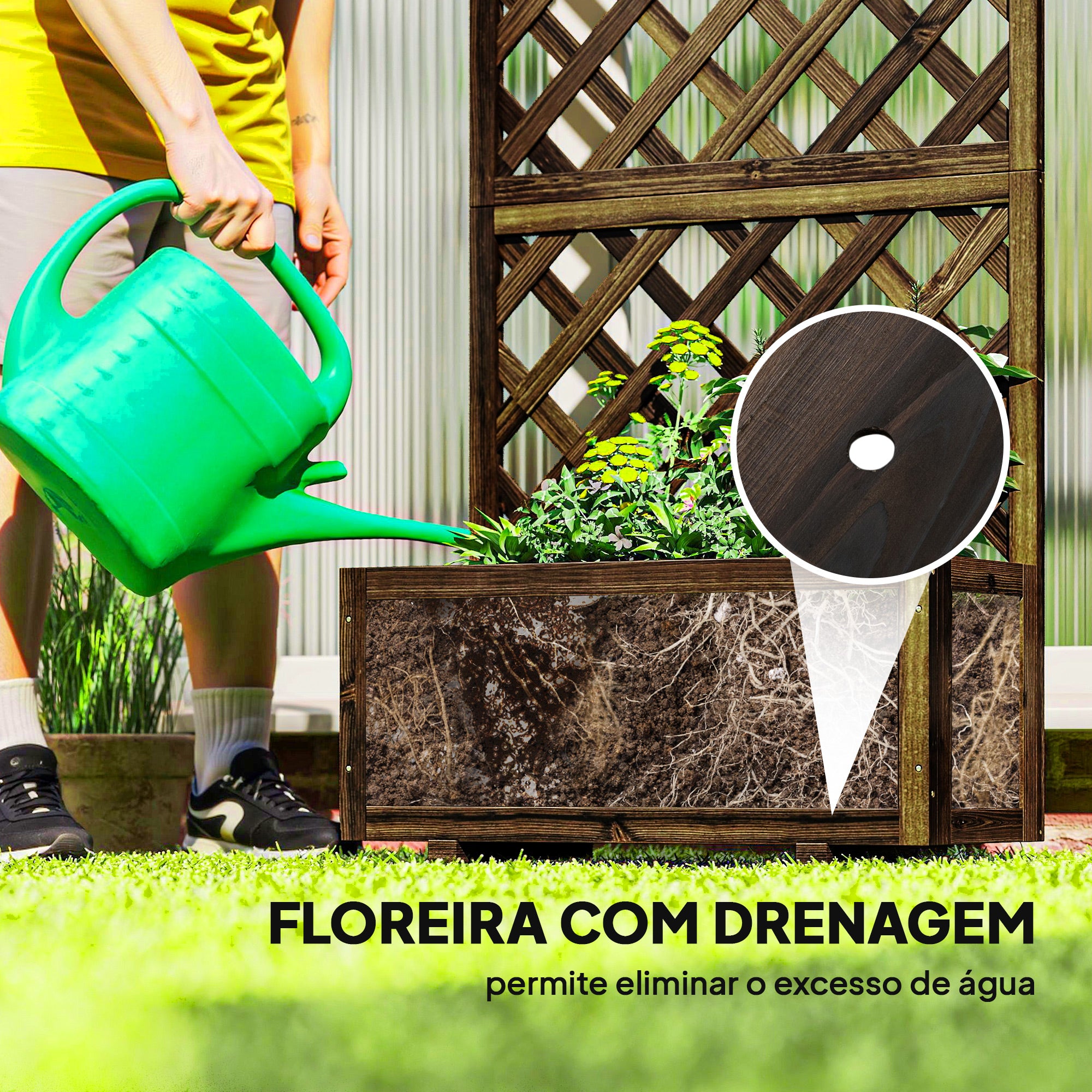 - Cor: Marrom carbonizado Material: Madeira de abeto Medidas totais: 72,5x31,5x149,5 cm (CxLxA) Medidas do interior da caixa de plantio: 67x25x27 cm Medidas da grade da treliça: 8x8 cm Carga máxima: 25 kg Referência: 845·127BN