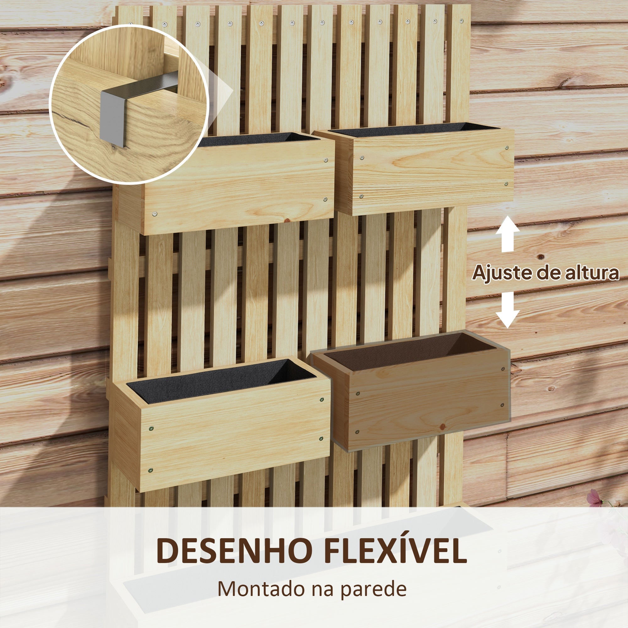 • Treliça traseira para que as trepadeiras possam crescer e envolver Vasos com altura ajustável para se adaptar às necessidades de diferentes plantas Tecido não tecido e dois orifícios de drenagem na base beneficiam as raízes e o solo Floreira grande para exterior com amplo espaço para plantar legumes, flores e ervas aromáticas Estrutura de madeira de abeto forte e estável, com revestimento protetor Design para fixação na parede que economiza espaço, permitindo personalizar a altura Esta grande floreira exterior requer montagem