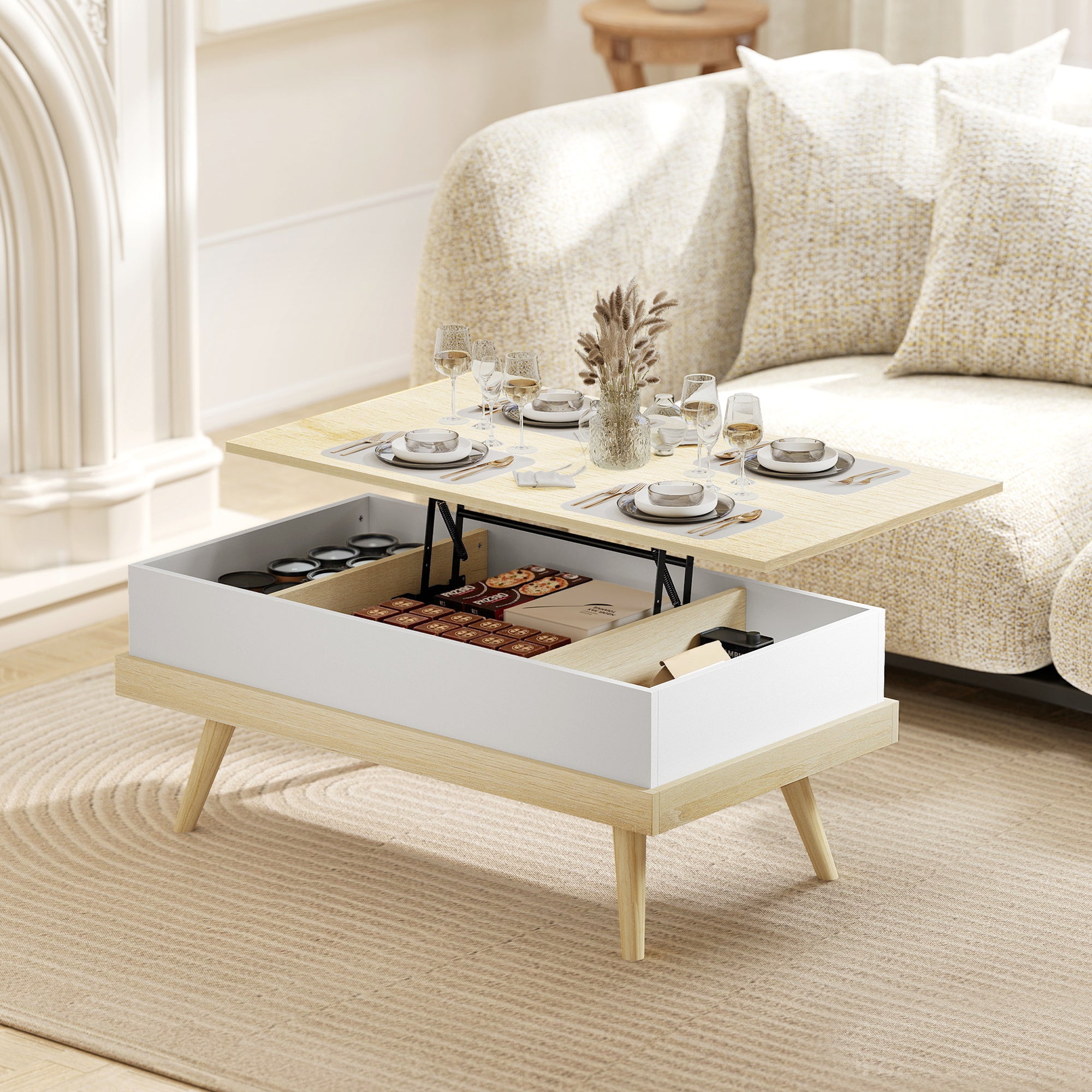 Mesa de Centro Elevatória Mesa de Centro Sala de Estar com 3 Compartimentos de Armazenamento Ocultos e Pés de Madeira para Escritório Dormitório 100x79x54 cm Madeira e Branco
