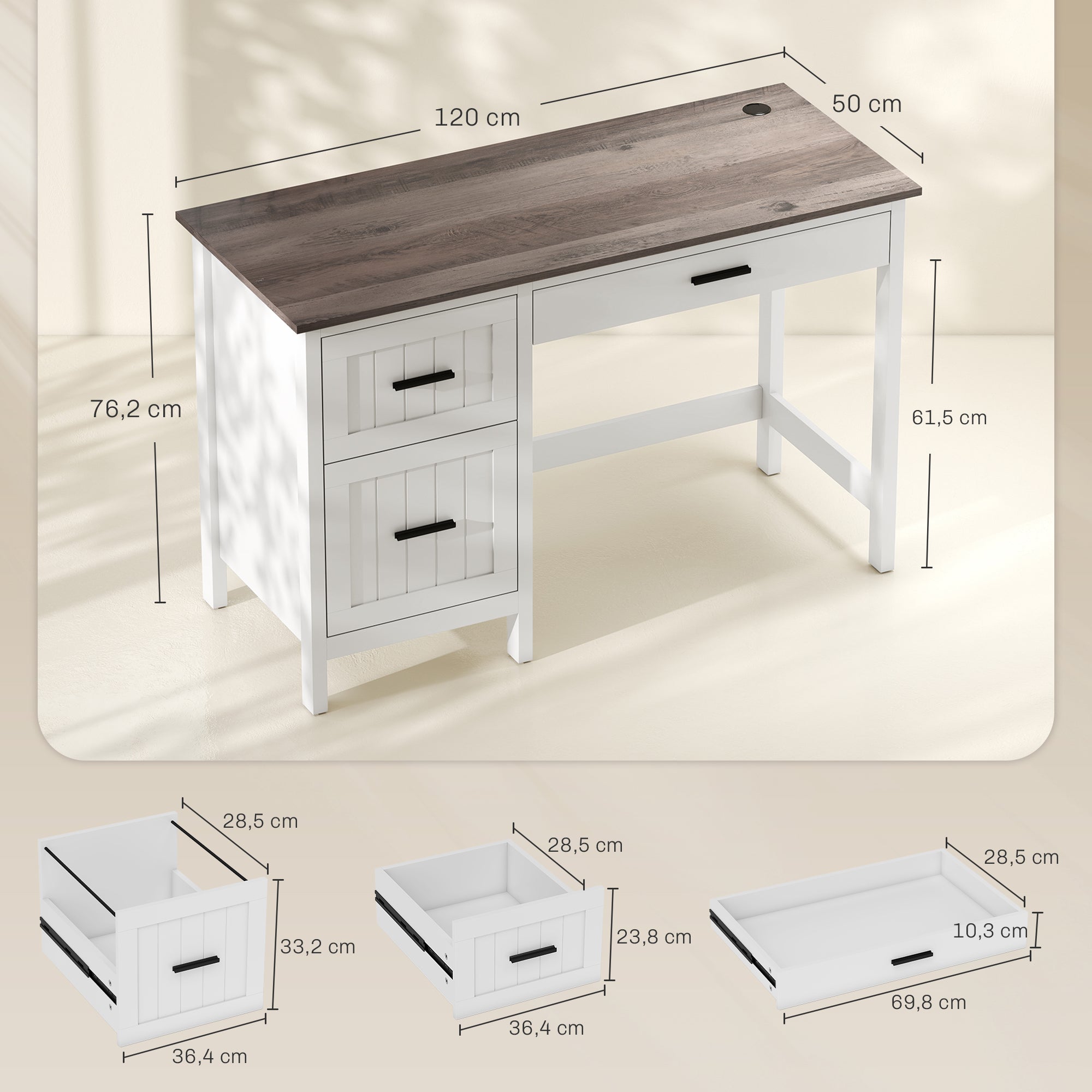 - Três gavetas oferecem amplo espaço de arrumação, mantendo a sua área de estudo e trabalho organizada A gaveta inferior inclui trilhos ajustáveis para acomodar pastas de arquivo A4 ou carta O espaço generoso sob a secretária permite esticar as pernas com conforto ao longo do dia A bancada com efeito madeira rústica e a estrutura branca combinam com qualquer decoração de escritório Fabricados em melamina de madeira e MDF resistentes suportam até 95 kg Secretária com 120x50 cm adequada para portátil, livros e essenciais de escrita ou estudo Base elevada de 10 cm permite o fácil acesso de robots de limpeza Requer montagem