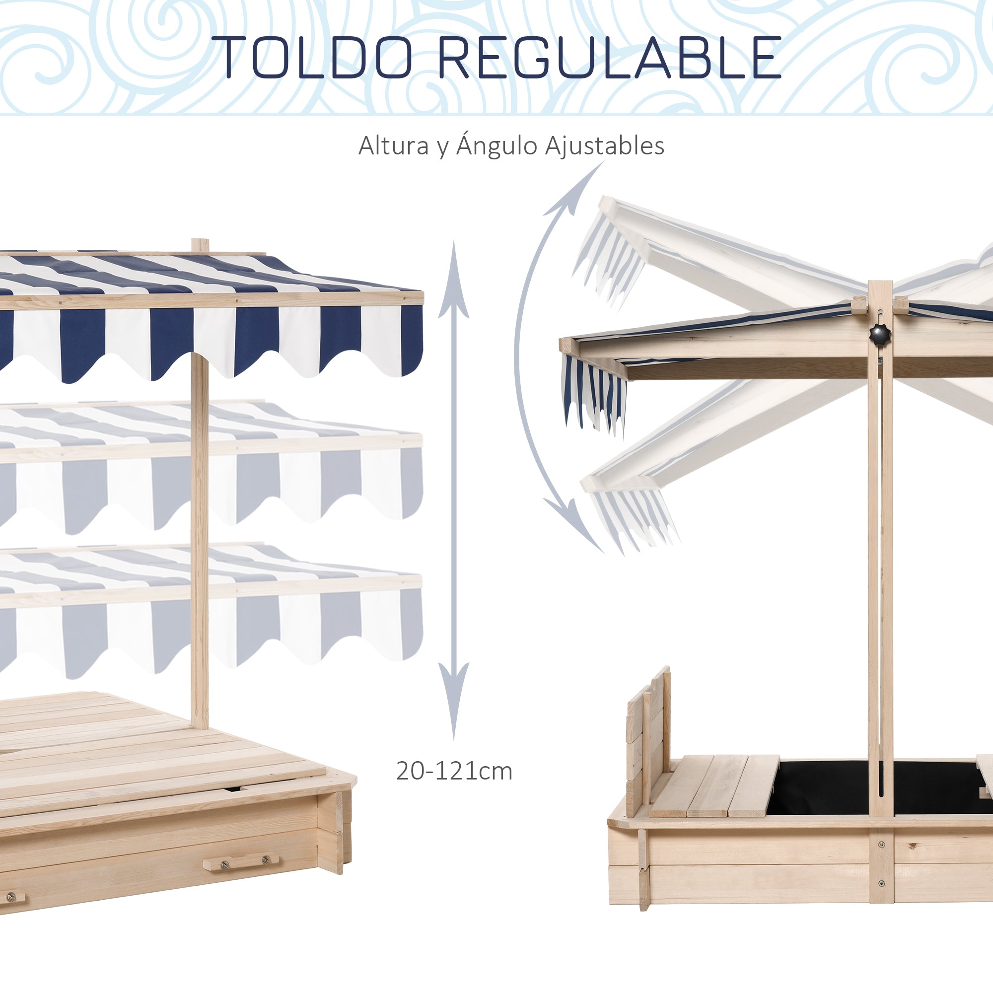 - TOLDO AJUSTÁVEL: O toldo desta caixa de areia infantil pode ser regulado em altura e ângulo, para proteger os mais pequenos do sol enquanto brincam