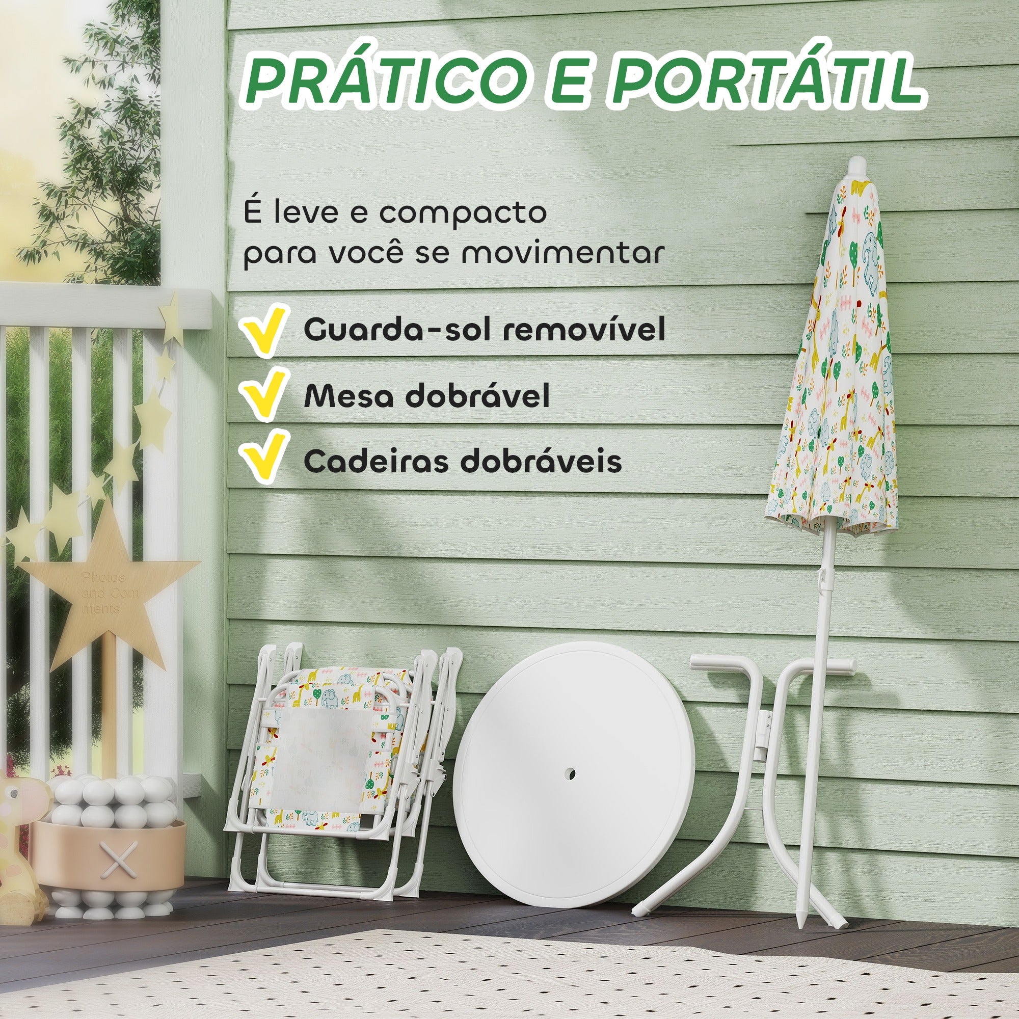 • MEDIDAS TOTAIS: Mesa: Ø49,5x50 cm (DxA). Cadeiras: 36,5x38,5x50 cm (desdobradas) e 48,5x36,5x6,2 cm (dobradas). Guarda·sol: 100x86·122 cm (DxA). Carga máxima: 35 kg (cadeira) e 20 kg (mesa). Cumpre as normas: EN71·1·2·3, EN17191. Requer montagem O pacote inclui: ? 1 x Mesa; ? 2 x Cadeira; ? 1 x Guarda·sol; ? 1 x Manual de instruções Transforme o seu jardim num espaço encantador de diversão com o conjunto AIYAPLAY de mesa e cadeiras dobráveis para crianças, com um adorável design de elefantes e girafas e cor branca. Este conjunto inclui duas cadeiras dobráveis e uma mesa com um orifício central para o chapéu de sol ajustável, ideal para proteger do sol. Perfeito para crianças de 2 a 5 anos, o conjunto é fácil de dobrar, facilitando o armazenamento.