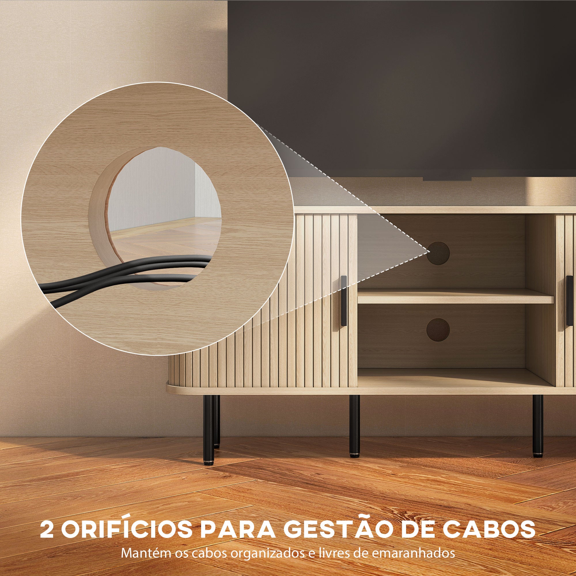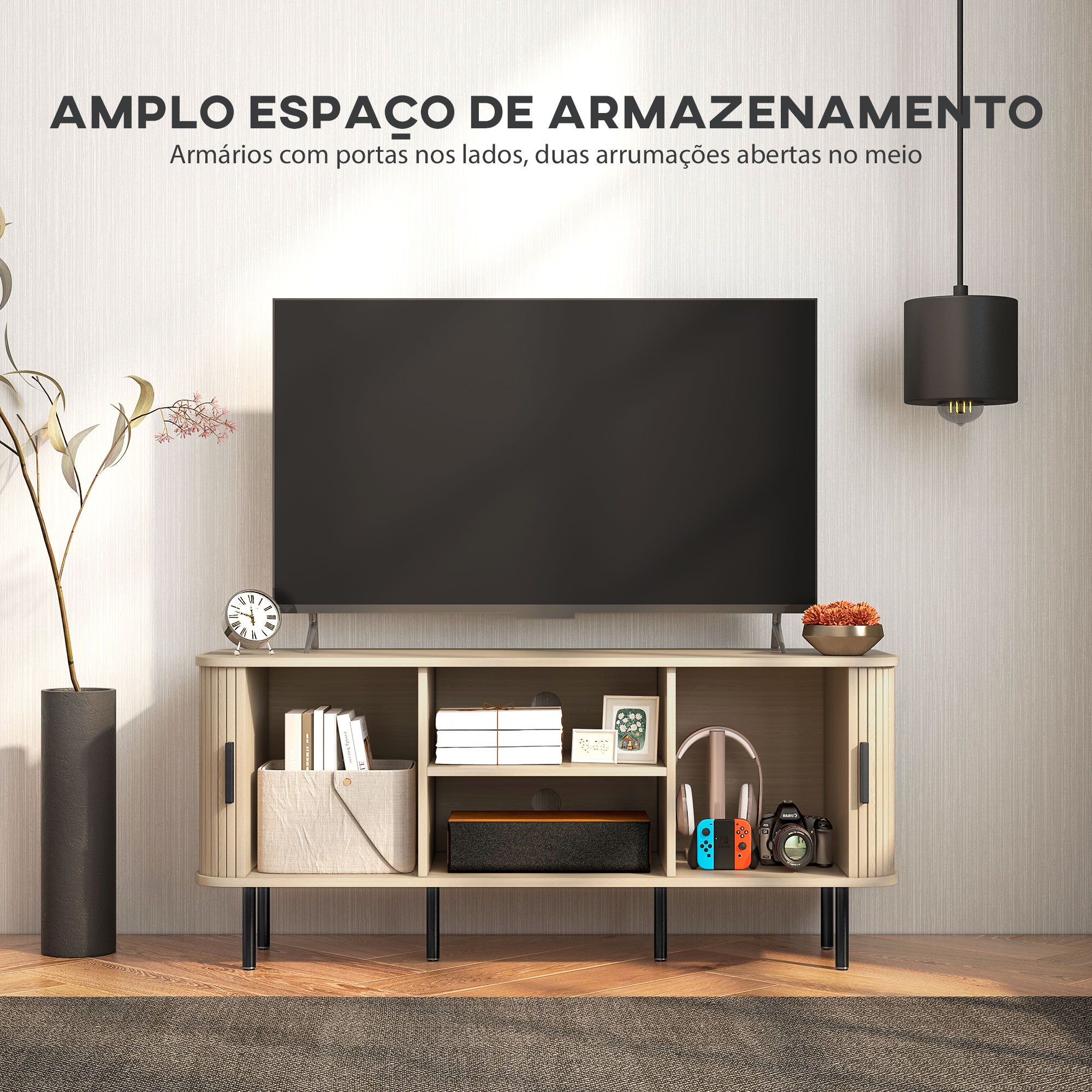 • MEDIDAS TOTAIS: 120x40x55 cm (CxLxA). Peso máximo suportado: 90 kg (total). Adequado para televisores até 55". Montagem necessária Descubra o charme deste móvel para televisão da HOMCOM, que combina o estilo moderno de meados do século com o carácter prático. Esta unidade possui duas prateleiras abertas e dois armários com portas com ranhuras, oferecendo um amplo espaço para os seus filmes, jogos de vídeo ou livros favoritos. Estão incluídos dois passa·cabos para manter tudo organizado. Sem dúvida, o complemento perfeito para os seus momentos de descanso